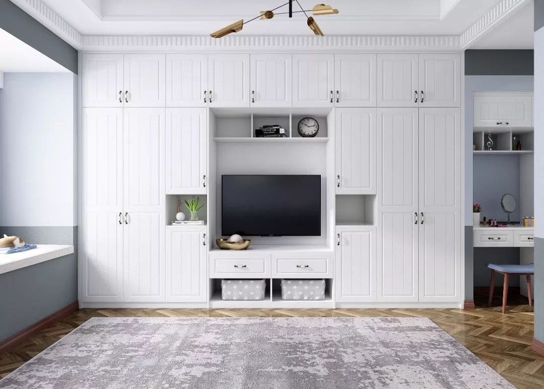 客厅是全家人的互动交流空间,设计时首要考虑的就是五个人的储物需求。电视柜设计成掩门、抽屉和隔板架三大区域,方便家人分类放置物品。错落的层级以及杏白柜门上的线条,设计感和收纳实用率都满分~