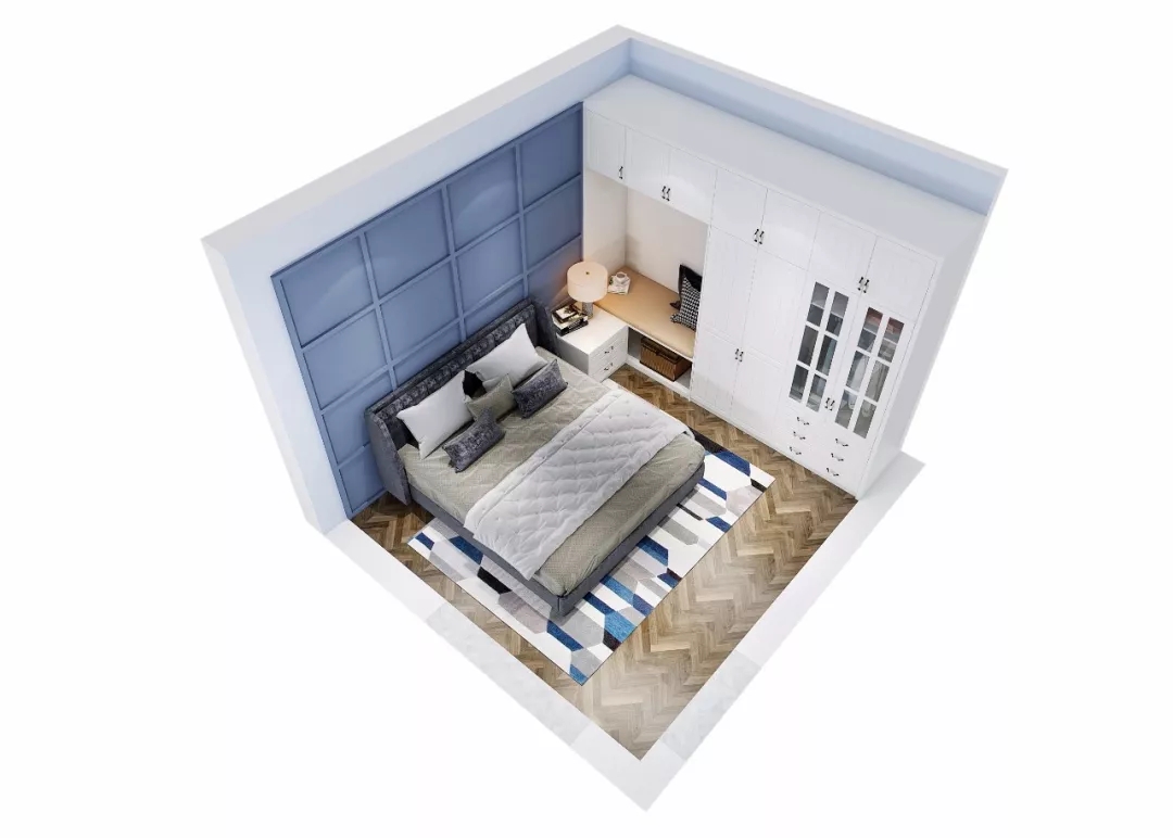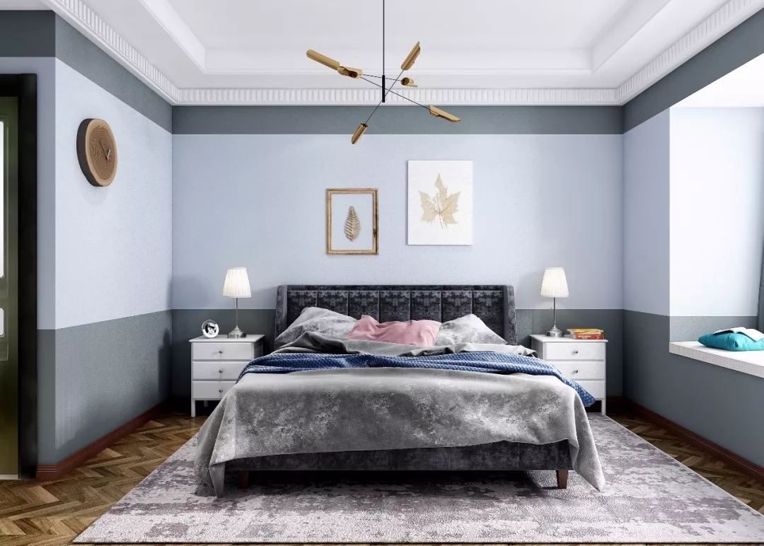主卧房间的整体以白色为主色调,背景色则选用了浅蓝色+灰色的跳色方案,打造出舒适的休息空间。