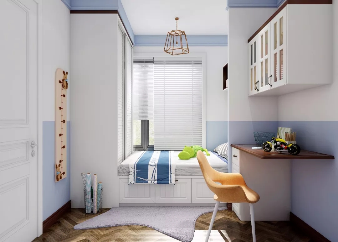 榻榻米的设计充分考虑了儿童房在纵向空间上的收纳延伸,底部的抽屉收纳区,靠墙的大衣柜,转角书柜和学习区一体化的设计,各个模块相互独立,把空间利用率最大化。