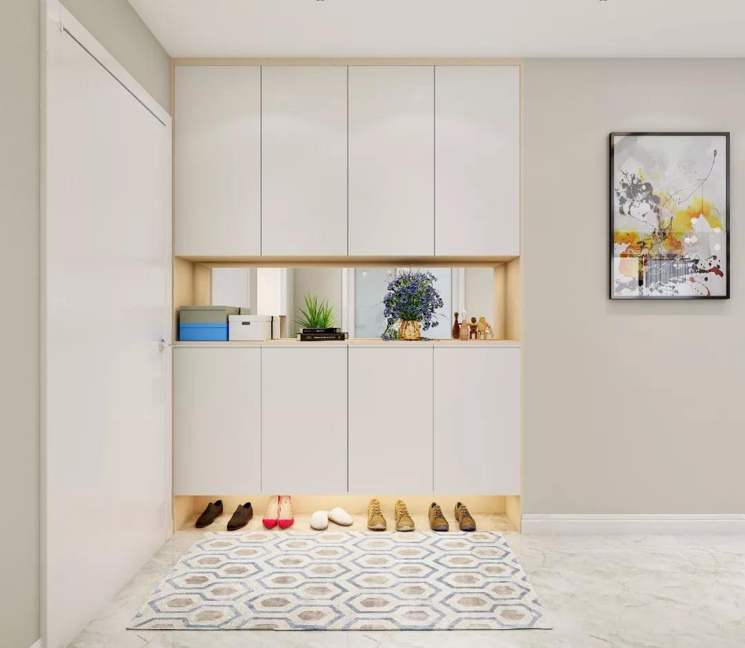 入门处打造了一个嵌入式鞋柜,让空间得到充分利用。中间留出一排展示柜,偷偷地在背板处藏入一面镜子,营造出无限延伸的视觉错觉。鞋柜底部悬空,装上暖色系的感应灯带,解决门口玄关脏乱暗的问题。
