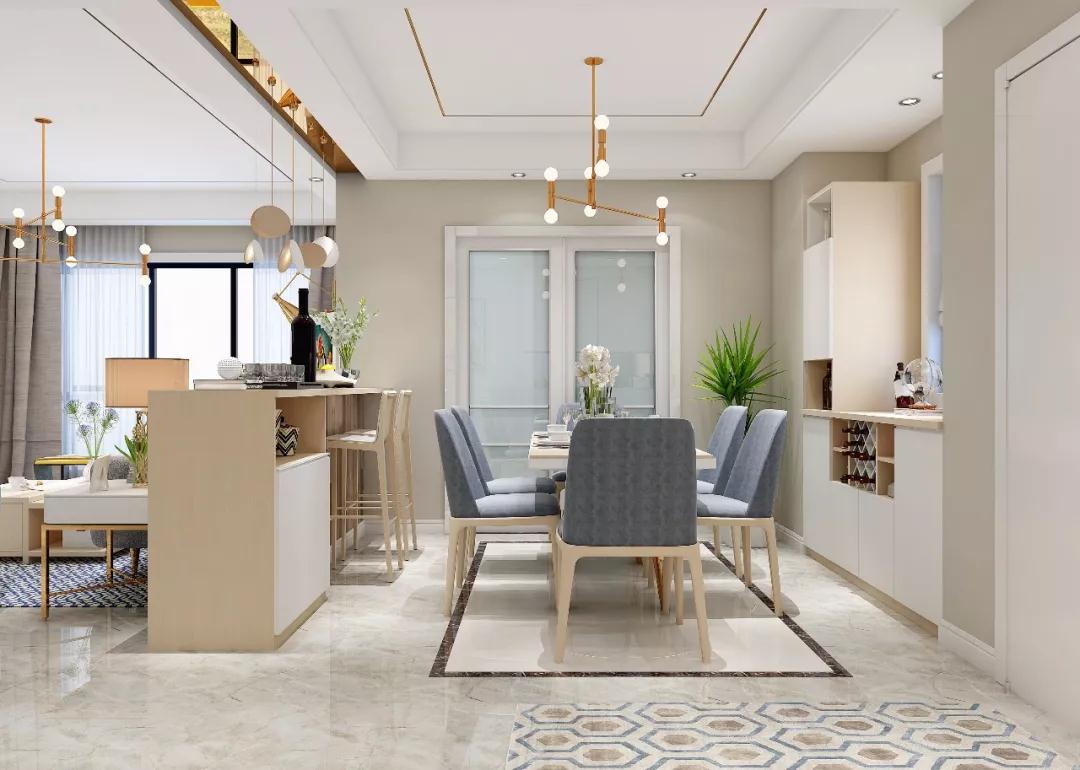 吧台代替墙体隔断,有效隔开客厅和餐厅。这里既可以是用餐区,品酒喝茶享受惬意时光,也可以作为休闲区,看书工作两不误。由于吧台的位置处于客餐厅吊顶交界处,于是在上方嵌入黄铜调色板,再加上一组温馨的吊灯,让精致和轻奢在这里得到最美的碰撞。