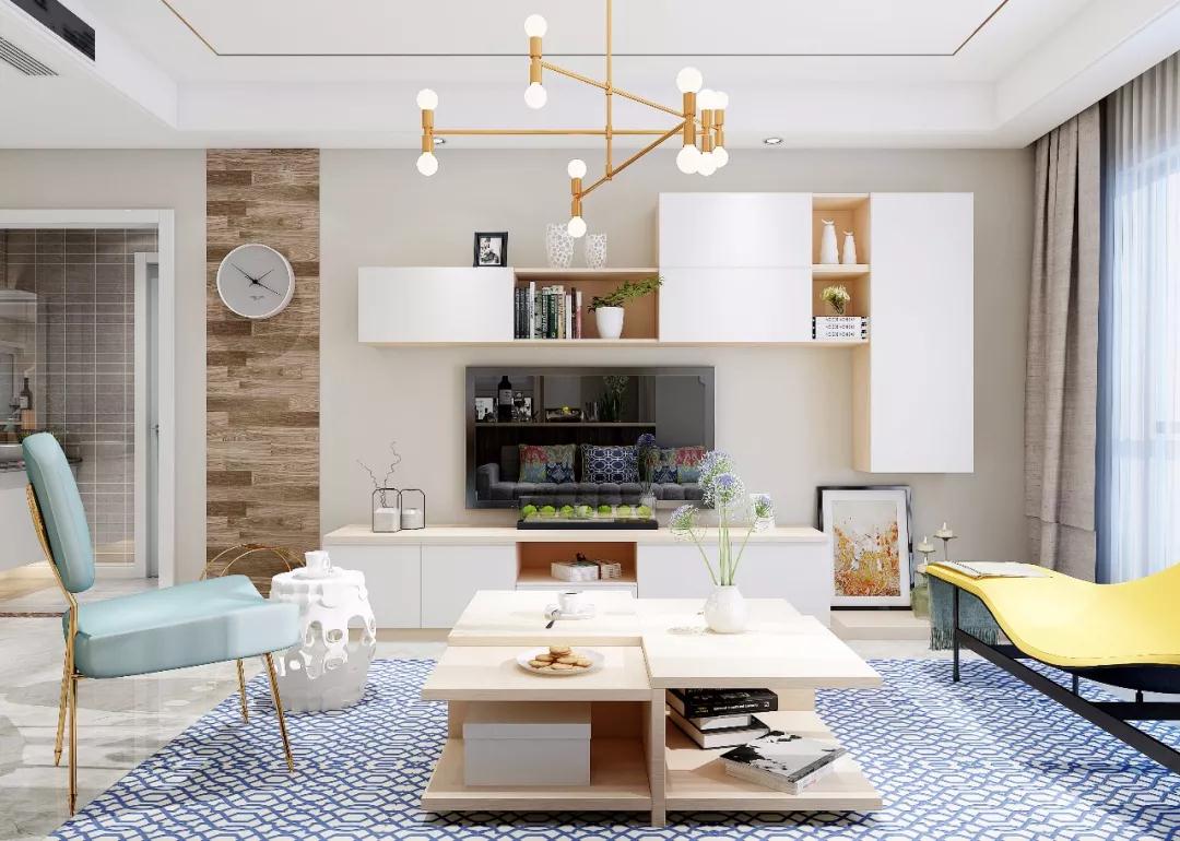 电视背景墙处选用错落吊柜和矮柜组合的设计,边角处还进行了圆润处理,降低平时磕碰受伤的危险指数。抛弃常见的方正版茶几,设计师采用高低错落的几何变形设计,高能开启茶几的分格储物模式。