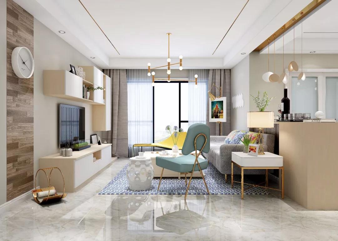 为了照顾采光和空间的通透感,客厅处设计了一面超大的落地窗,窗帘采用入墙到地的方式,使空间在纵深上有拉高的视觉效果。吊灯、凳子和沙发腿、边几腿和收纳篮都采用了网红级别的黄铜配色,搭配黄龙玉抛釉砖,瞬间提升客厅的质感,一股极强的艺术张力迎面扑来。