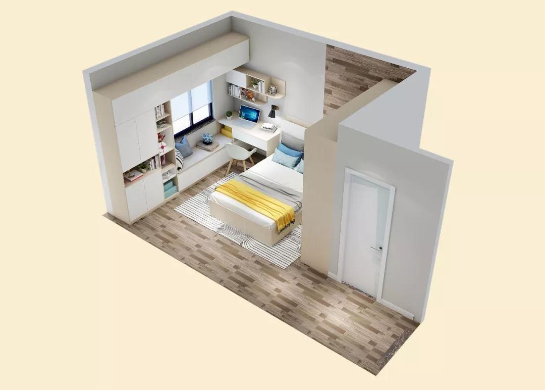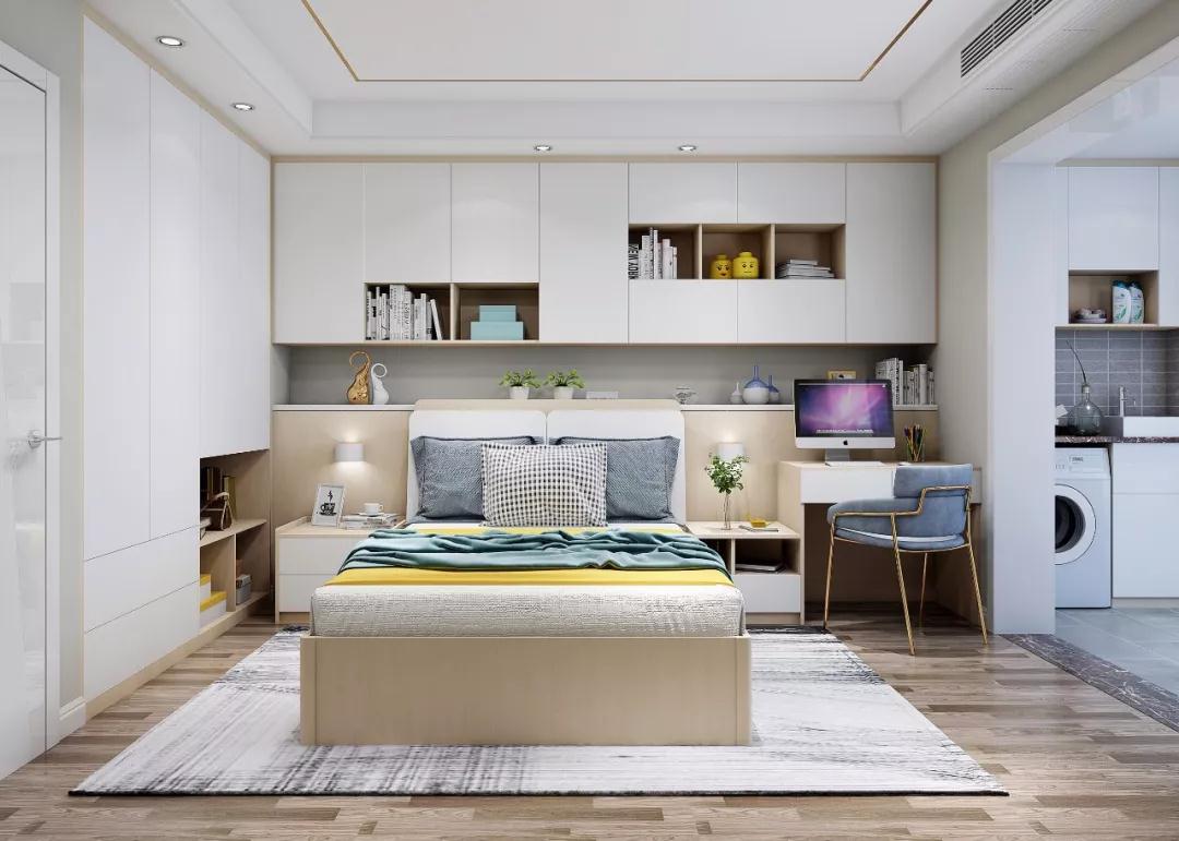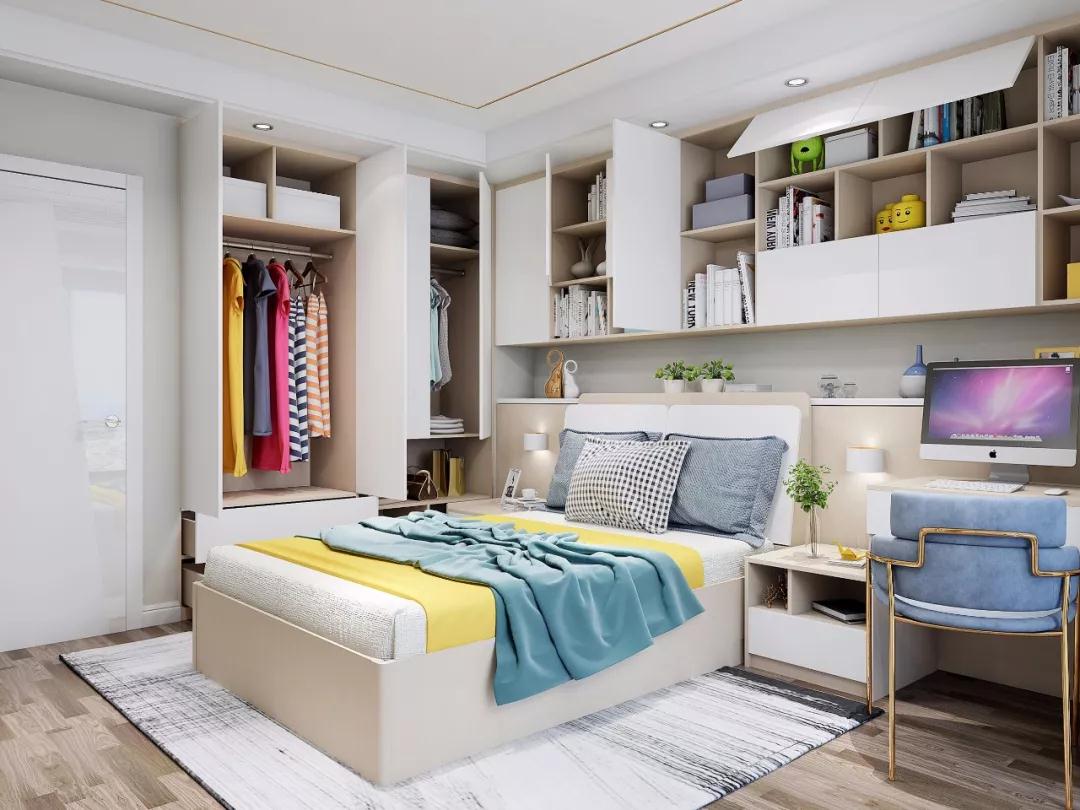 卧室里有一扇超大的窗户,屋主利用格局打造出飘窗组合柜,一柜多用,充分放大空间的储物能力。床上四件套配色也让屋主花足了心思,亮黄色的床单配上薄荷绿和海蓝色的靠枕,浅色系的清新带来温馨明快的视觉感受,卧室是家里待的时间最久的空间,看着舒适,住着更要舒适!