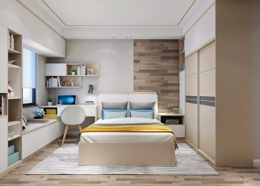 卧室以格调白和原木色为主基调,搭配深浅过渡木纹砖的地面设计,自带色差效果,营造出自然质朴的氛围。嵌入式的移门衣柜,将收纳能力最大化。背景墙是卧室空间最独特的设计,深浅木纹砖与格调白背板混搭,新颖又具有独特魅力,带来卧室不一般的视觉体验。