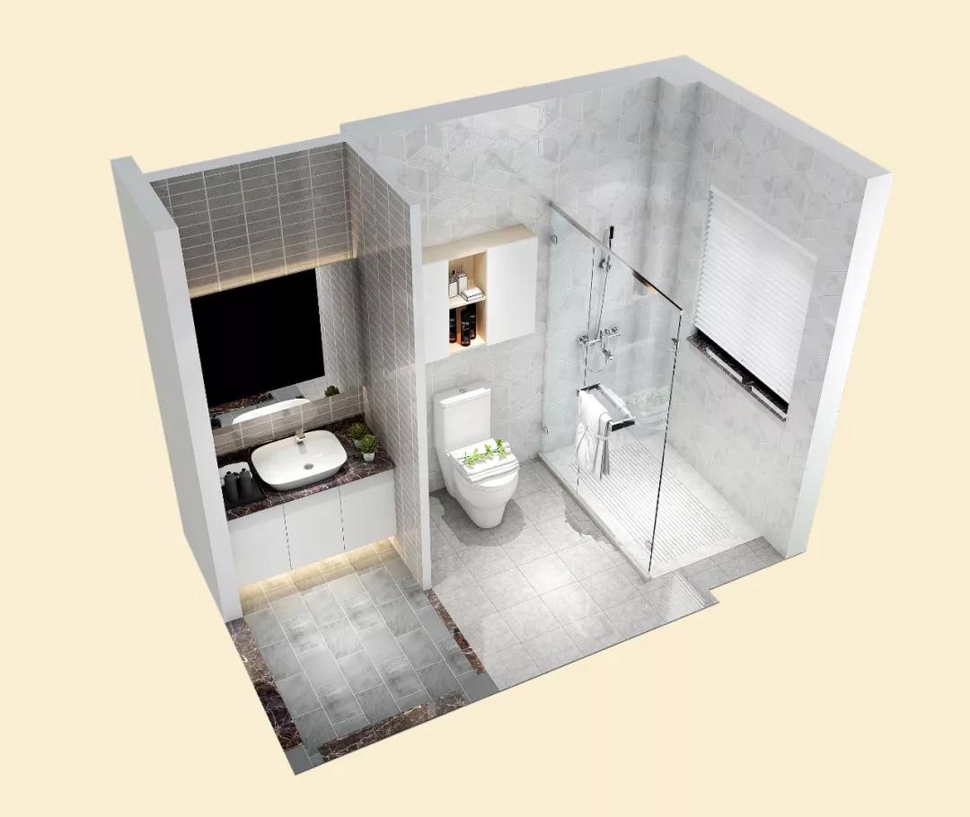 卫生间采用干湿分离的设计方式,淋浴区和马桶区用玻璃进行隔断,加上隔断处的门槛设计,有效进行防水处理。马桶区上方还设计了一组吊柜,用以储存纸巾、浴巾等常用物品,最大限度的利用卫浴这一小空间。