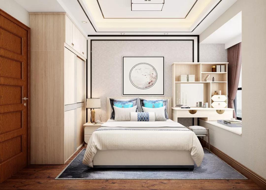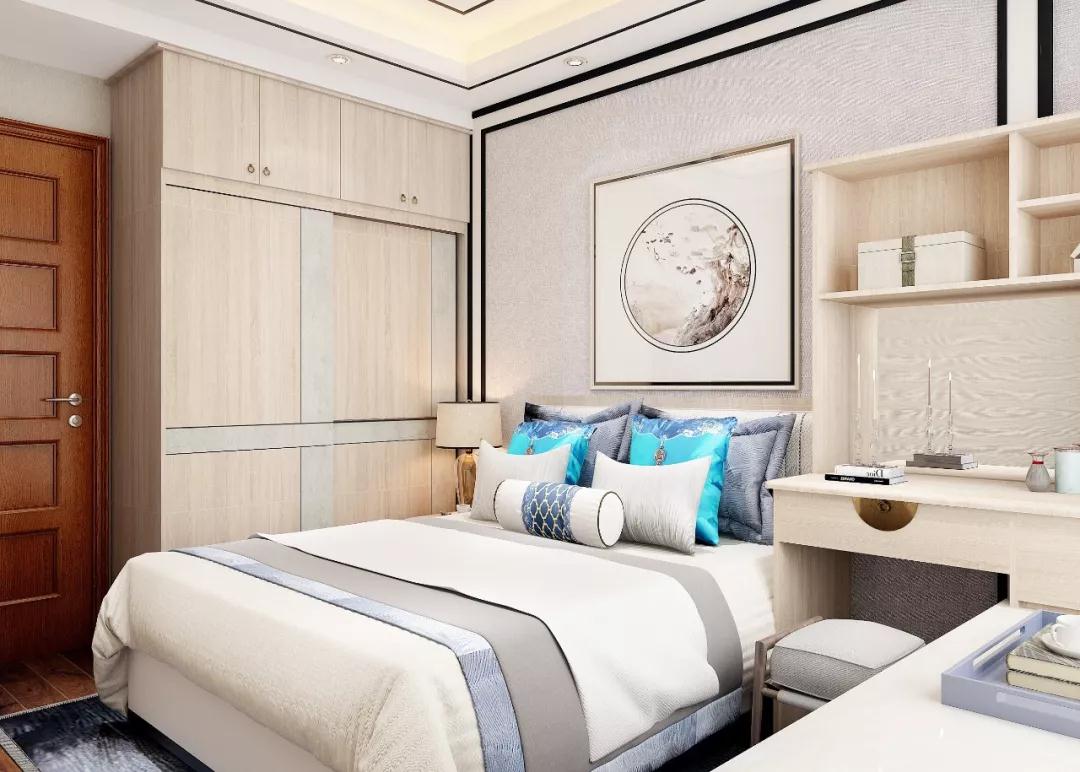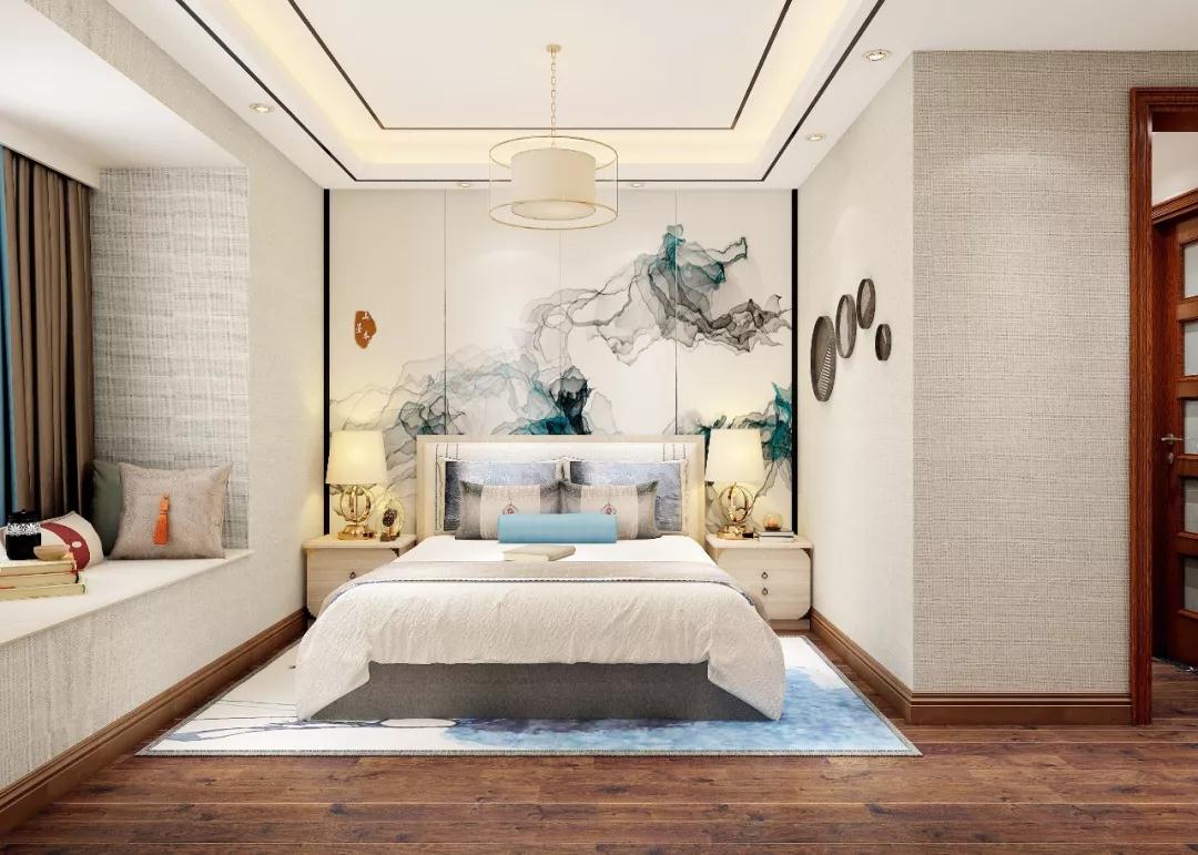 主卧注重的是舒适的睡眠氛围,所以在没有过多用重色,为了配合新中式的风格,墙纸特意用了无纺布材质的,还有吸音的作用,对睡眠浅的小伙伴特别友好。