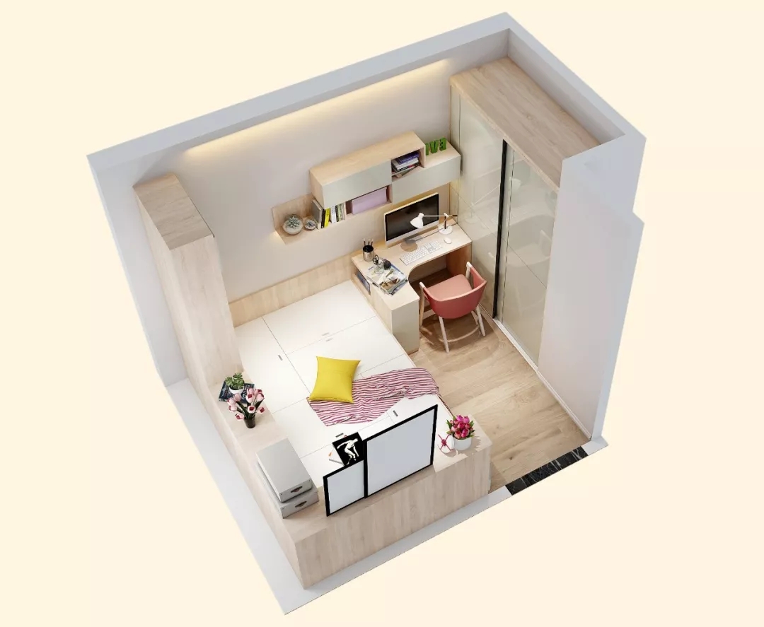 我们选择了用榻榻米,将空间开发到极限,凹陷处做衣柜,临窗位置是榻榻米休息区,吊柜+书桌的设计也极大地节省了空间。