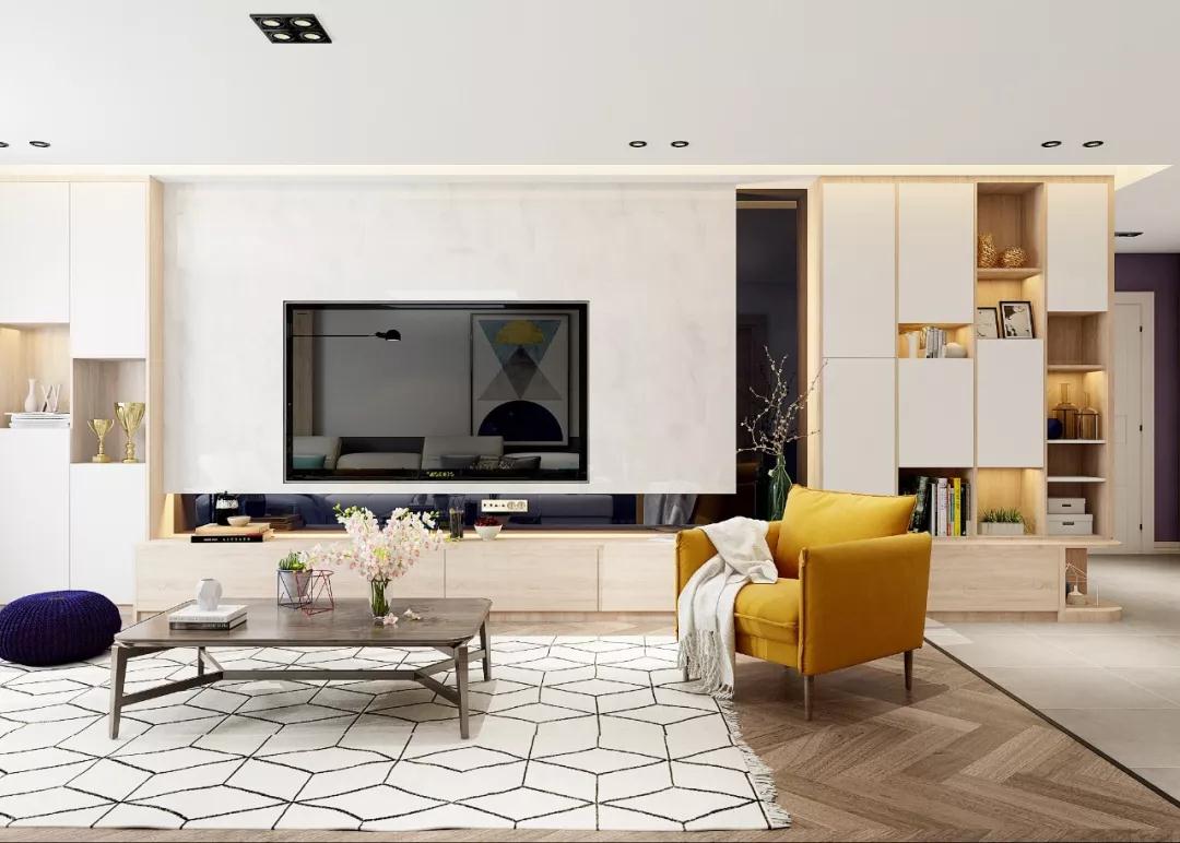 玄关进来右手边就是客厅,因为客厅阳台朝向东,虽然早上阳光好,但是下午会偏暗,所以沙发和电视墙都用了偏亮的色调。