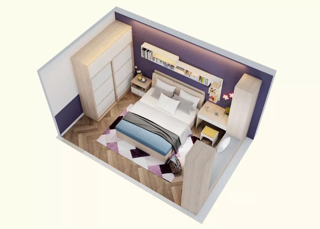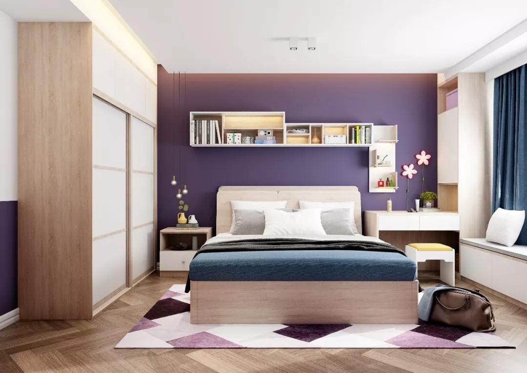 主卧的色调和客餐厅一致,但紫色在小空间运用更有挑战性。