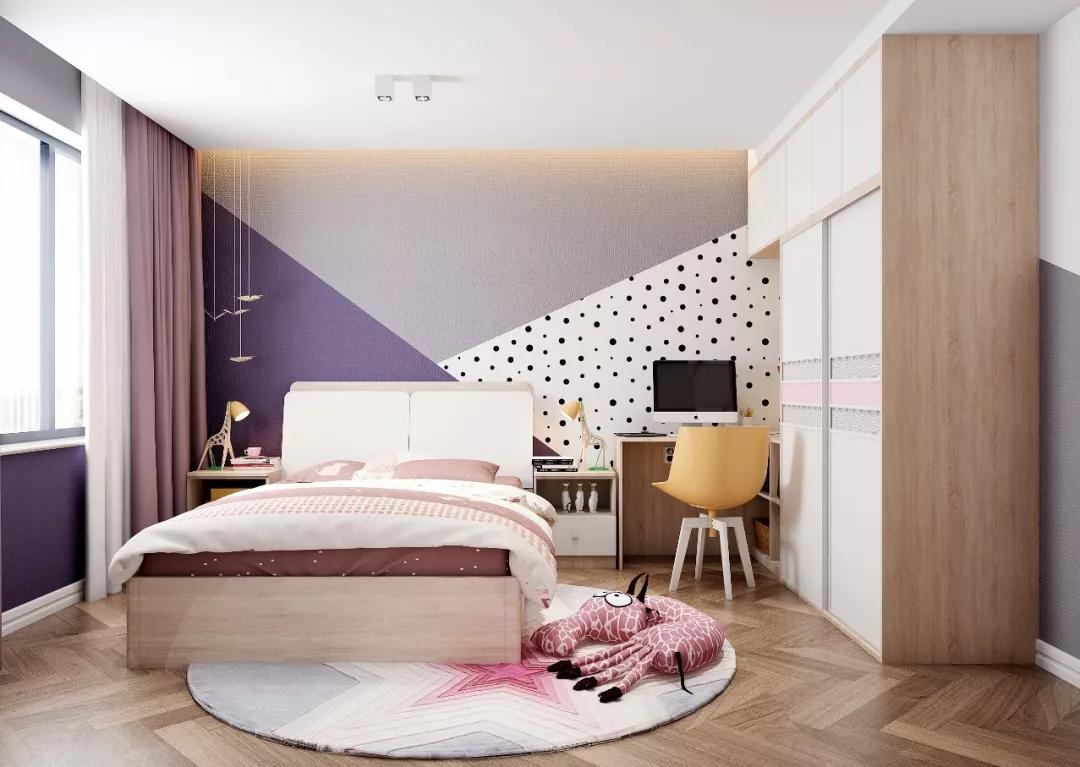 跟主卧不同,紫色在这里不再是唯一的主角,地毯设计了粉色、床品是豆沙色,墙面还搭配了灰色和波点黑,颜色的碰撞个孩子更多想象的空间和活力。