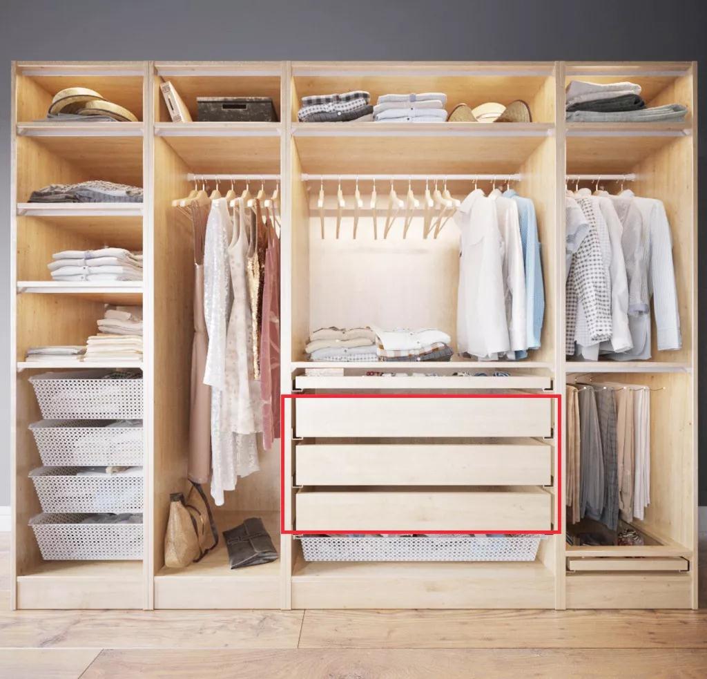 如果衣柜内部空间规划没有做好,那抽屉盒就派上大用场了,它可以把边边角角都利用起来,还能把储物模块安排地整整齐齐。