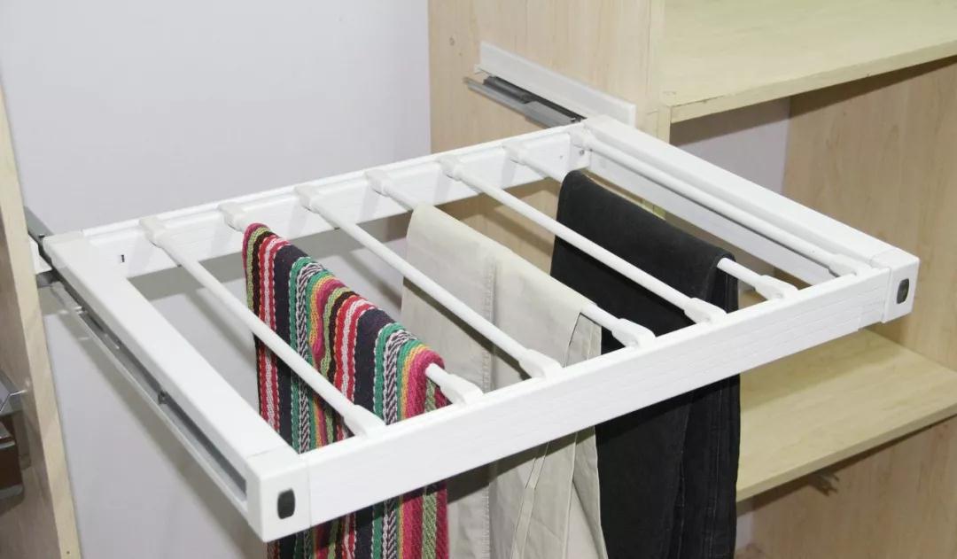 对于裤子的收纳,可以专门做一个裤架来放置。如果是放在衣柜底层,那至少要留出70cm的高度。