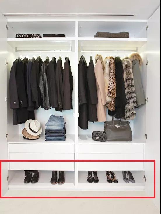 衣柜够大或者有衣帽间的话,可以将干净不常穿的鞋子也放到衣柜里。