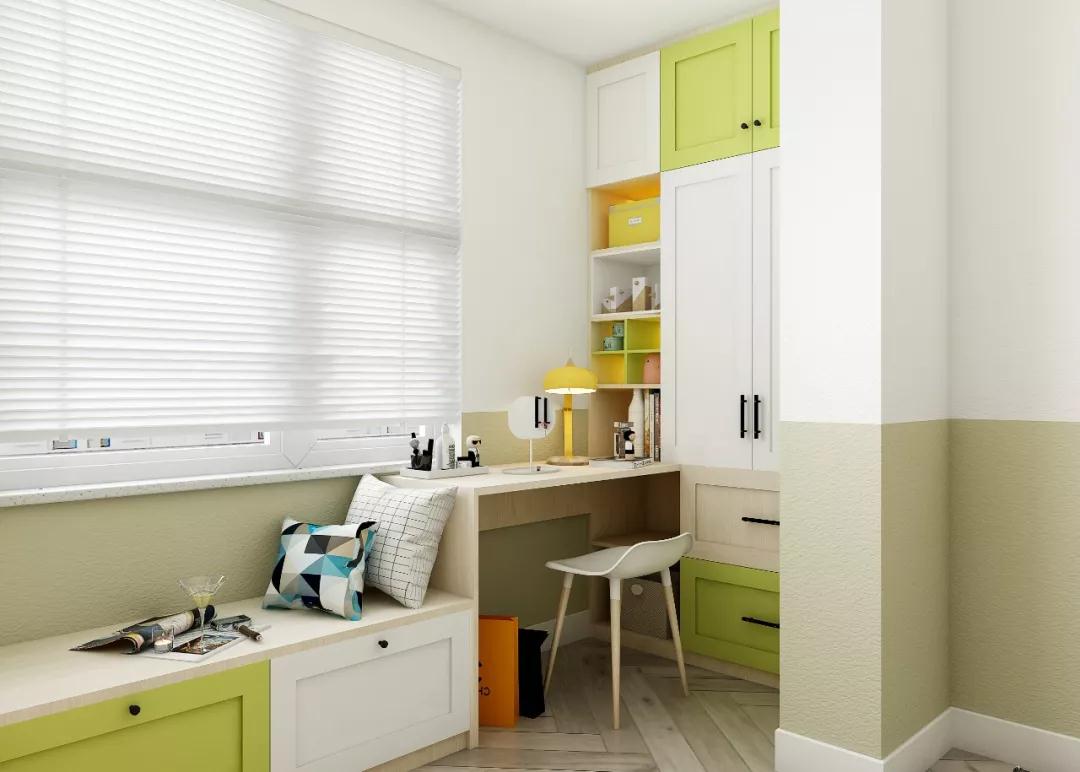房间采光最好的地方是孩子的学习桌,L型的桌子比较大,孩子随着年龄增长也不必担心不够用。