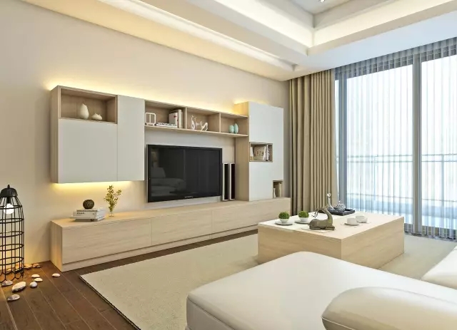 ▲ 客厅用简化的线条冲淡大容量电视柜的压迫感,沙发不靠墙,增加沙发背景收纳,保持客厅清爽整洁。