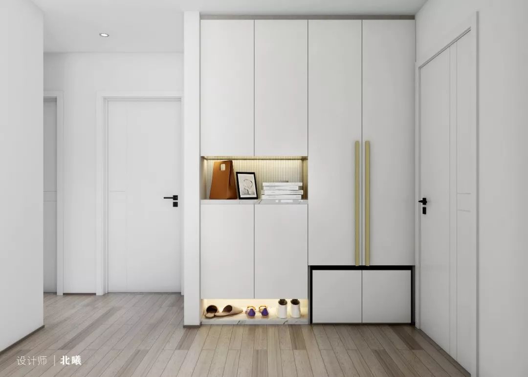 进门右侧打造格调白嵌入式玄关柜,采用整体掩门设计,使空间更简洁,搭配金色的简约流畅拉手,满满的高级感。每次回家,进门就是幸福的感觉。