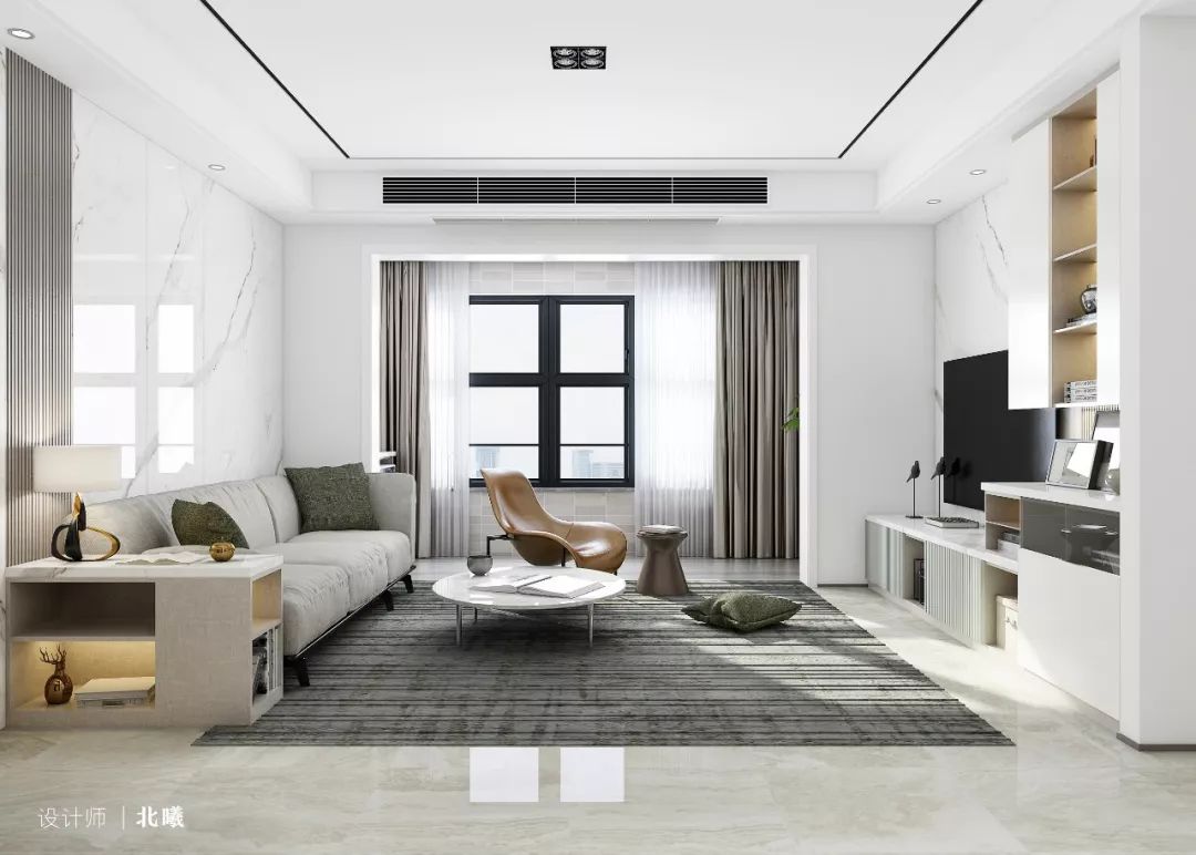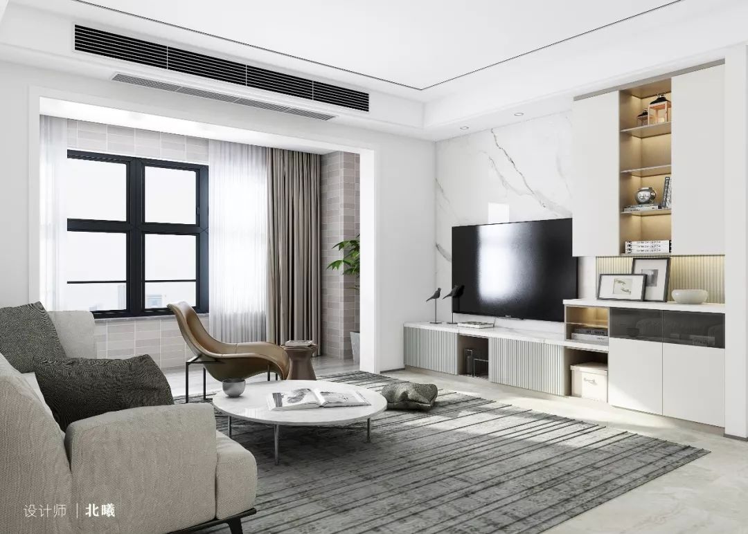 简化生活流程,也是业主夫妻追求的极简生活。所以客厅组合柜的设计稍微花了点心思,错落有致的柜体布置,门板与开放格的交错设计,有藏有露,在满足储物空间的同时,细化分区,明确生活动线。
