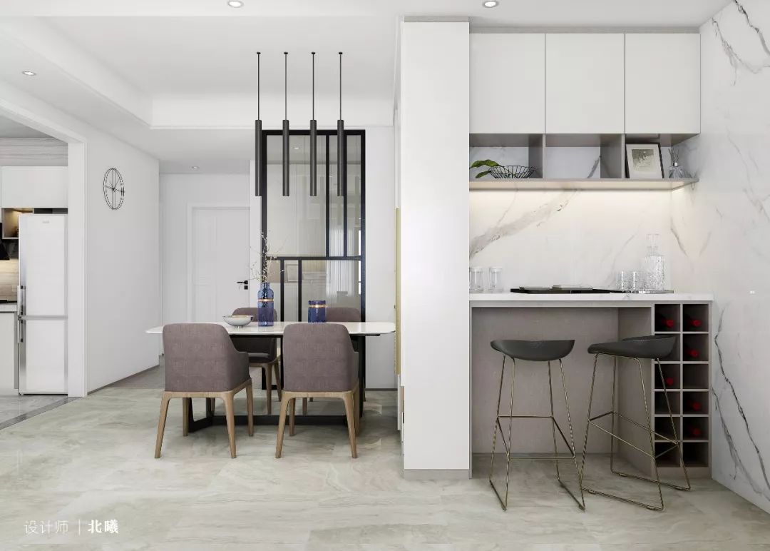 业主夫妻觉得回家就是要放松,简单舒适就好。客餐厨空间化纷繁为简洁,纯粹灰白的色彩、干净的线条,加以不同材质的碰撞,简约而有质感。
