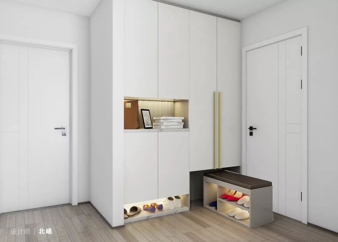 ▲左边柜子的中部采用开放式设计,下班回家就可以放下包包和钥匙;底部留空,常穿的鞋子放在这里,换鞋更便捷。