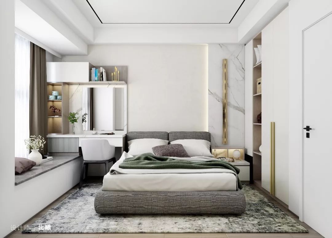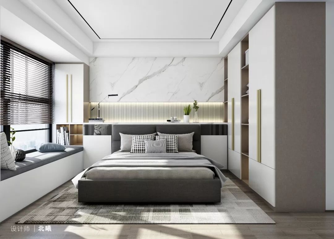 卧室主打温馨舒适,白色极简的空间融入雪岩背景墙,搭配深灰布艺软床,给人干净的视觉感,躺上去是极度的畅快和舒适。