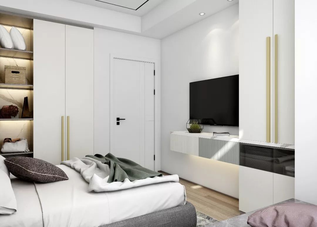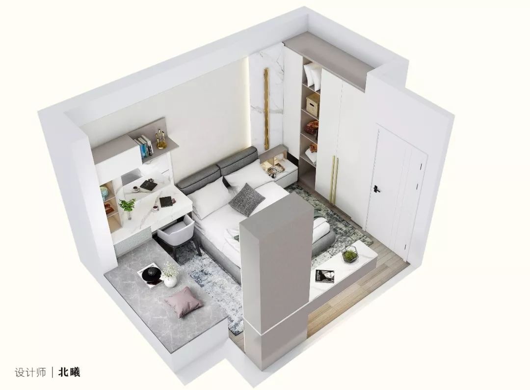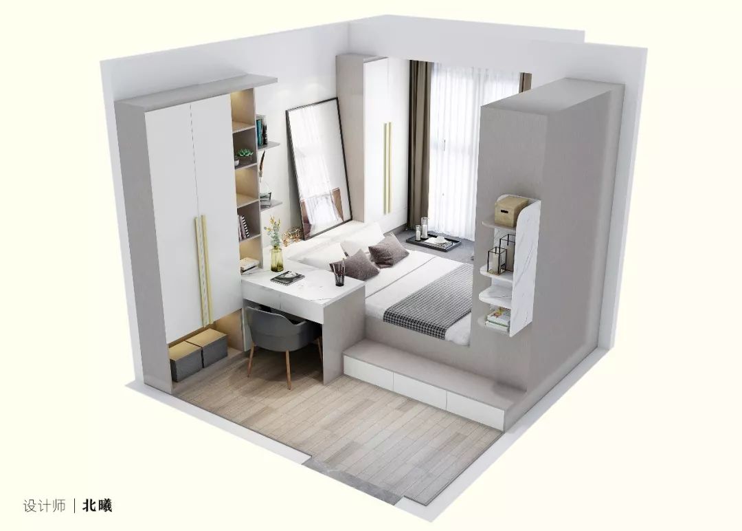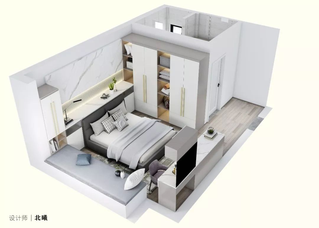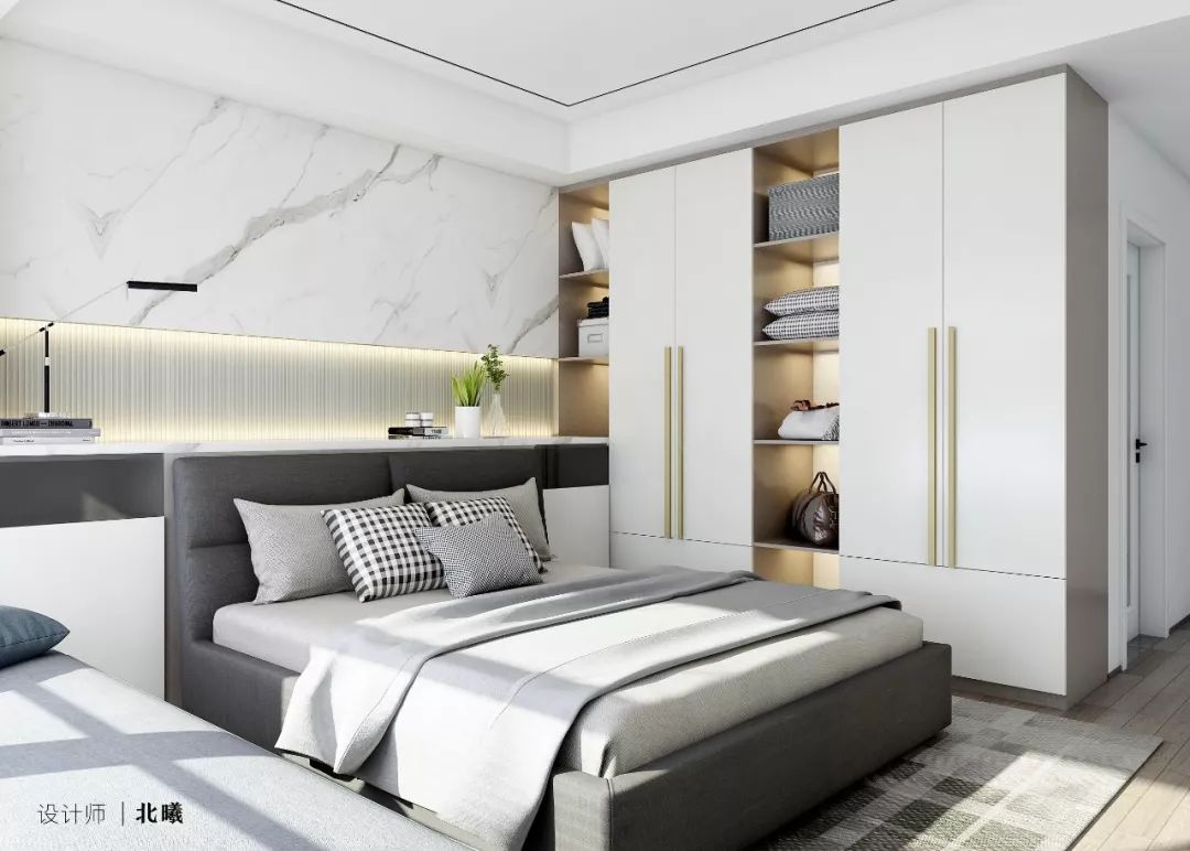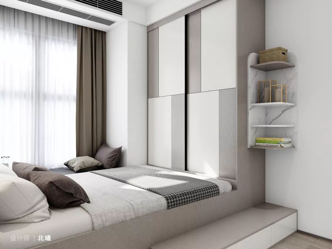 ▲榻榻米尾部打造到顶衣柜,储物能力超强,格调白+亚麻灰的柜门,设计感十足。