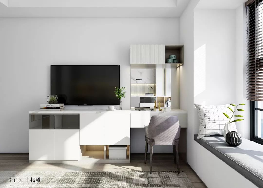电视柜与梳妆台一体化设计,雪岩台面更显格调,女主人在这里梳妆打扮,开启一天的好心情。