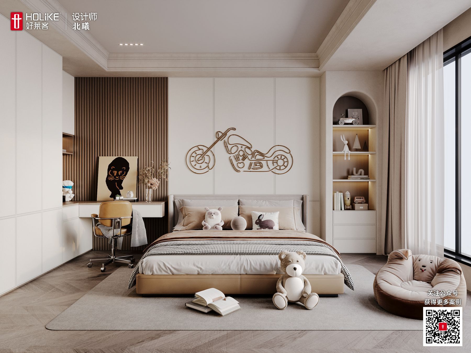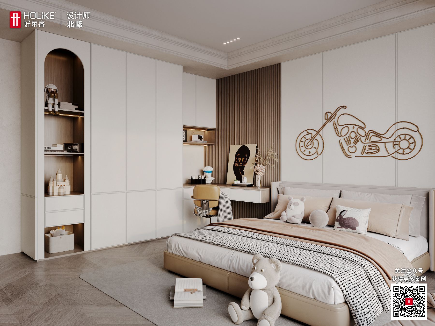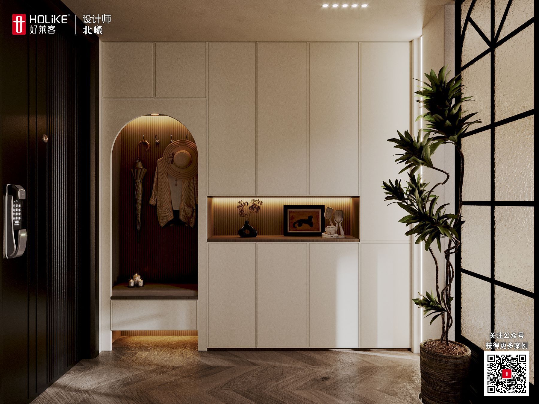 而是采用护墙+收纳柜+格栅隐形门的一体化设计