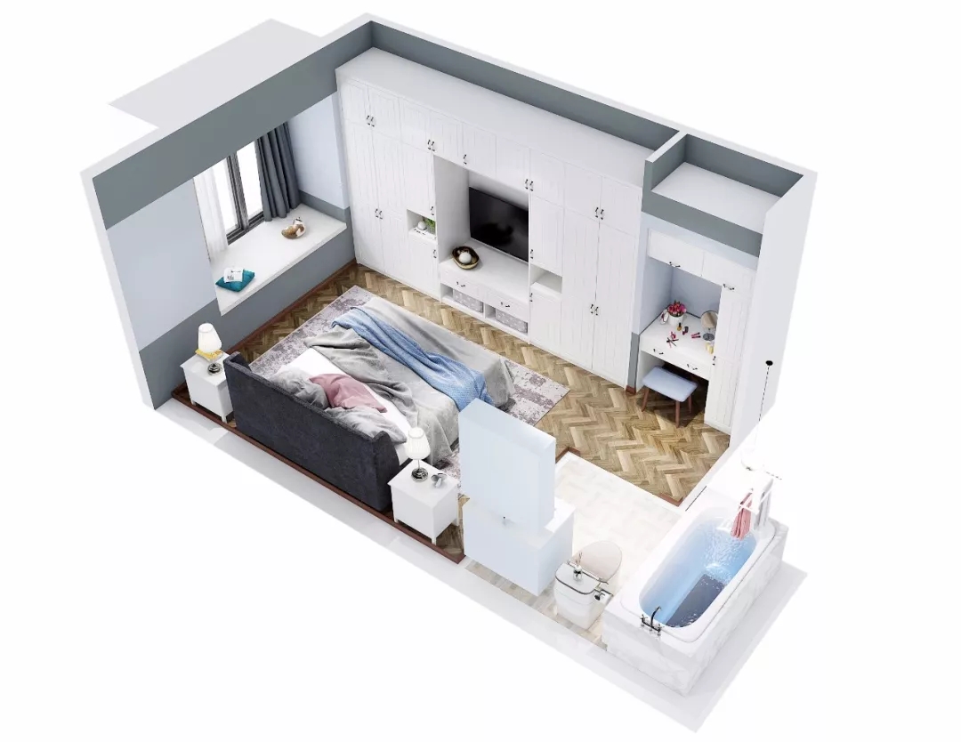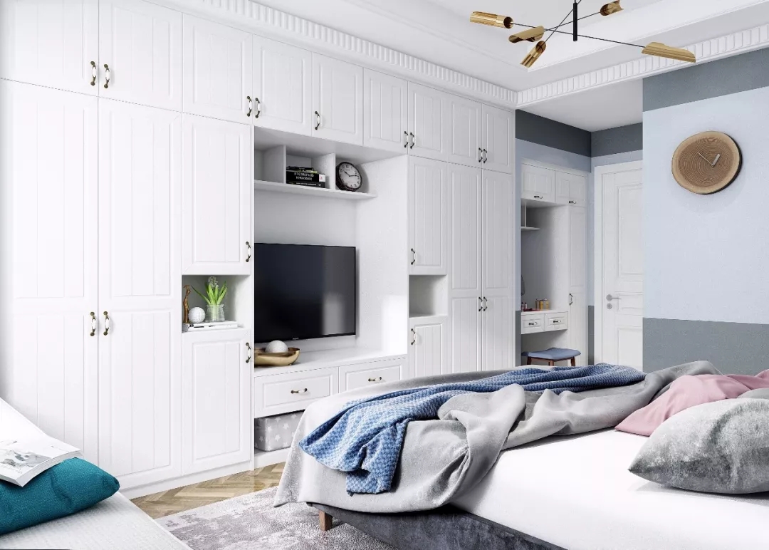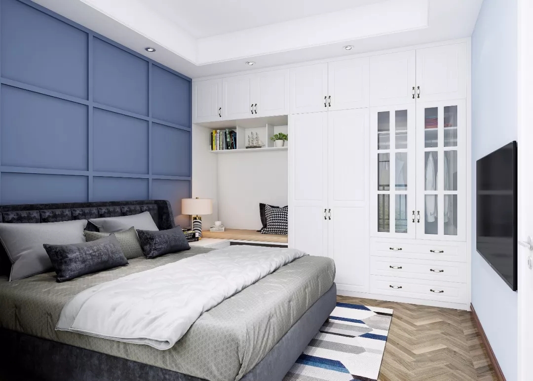 主卧房间的整体以白色为主色调,背景色则选用了浅蓝色+灰色的跳色方案,打造出舒适的休息空间。