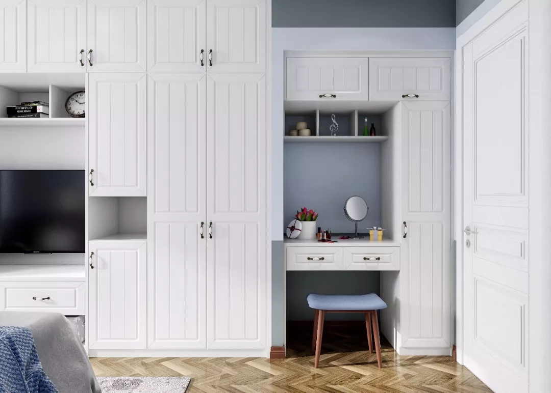 戴先生的主卧空间比较大,为了最大化的利用空间,设计师将客户的需求巧妙的融合在一起,进门凹位处打造了一张嵌入式梳妆桌,左侧设计了一组到顶的封闭式储物柜,既保证了空间的整体性,也解决了储物收纳的问题。