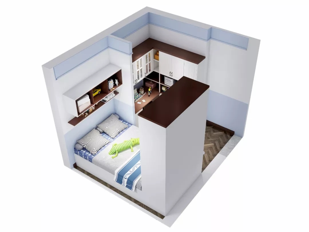 榻榻米的设计充分考虑了儿童房在纵向空间上的收纳延伸,底部的抽屉收纳区,靠墙的大衣柜,转角书柜和学习区一体化的设计,各个模块相互独立,把空间利用率最大化。