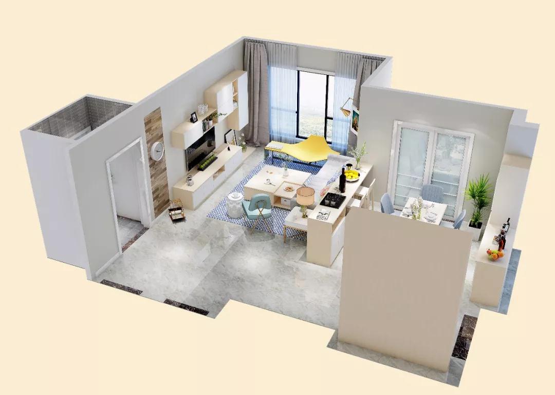 电视背景墙处选用错落吊柜和矮柜组合的设计,边角处还进行了圆润处理,降低平时磕碰受伤的危险指数。抛弃常见的方正版茶几,设计师采用高低错落的几何变形设计,高能开启茶几的分格储物模式。