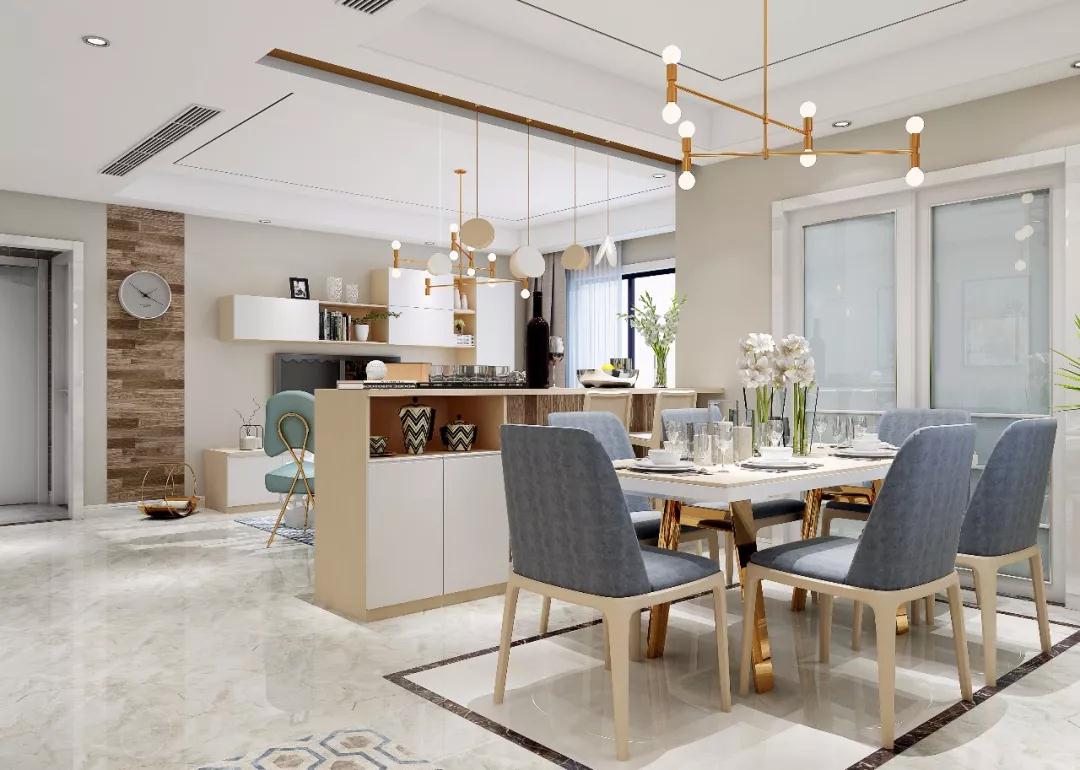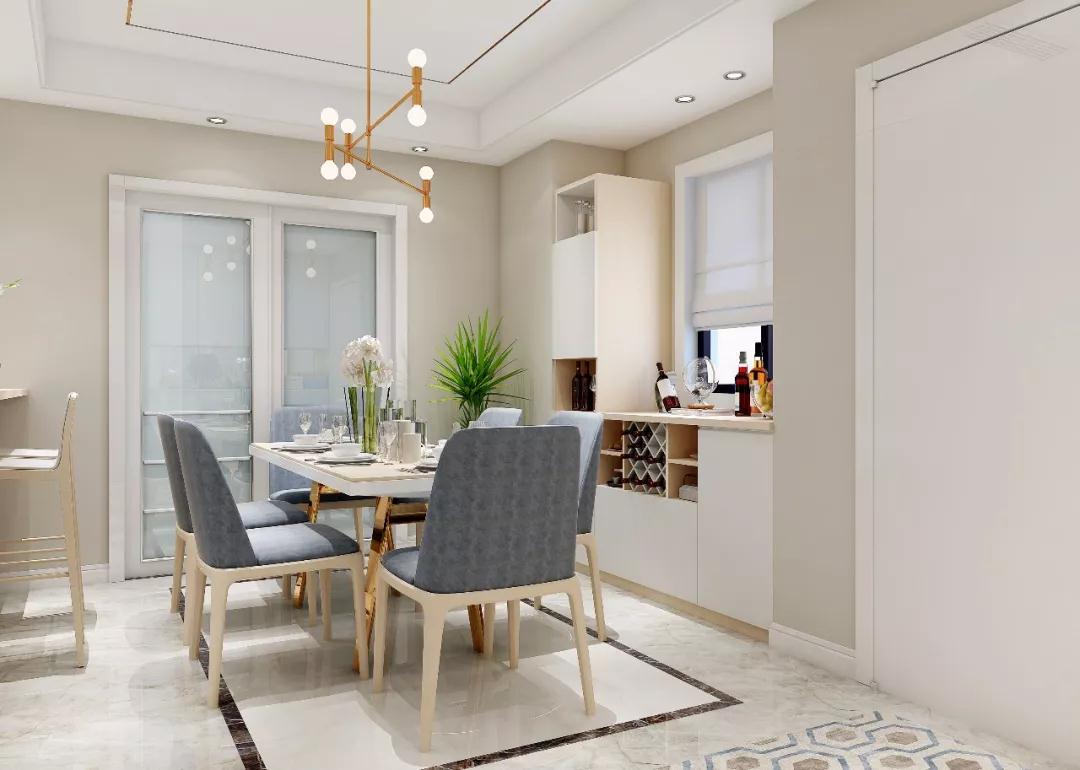 吧台代替墙体隔断,有效隔开客厅和餐厅。这里既可以是用餐区,品酒喝茶享受惬意时光,也可以作为休闲区,看书工作两不误。由于吧台的位置处于客餐厅吊顶交界处,于是在上方嵌入黄铜调色板,再加上一组温馨的吊灯,让精致和轻奢在这里得到最美的碰撞。