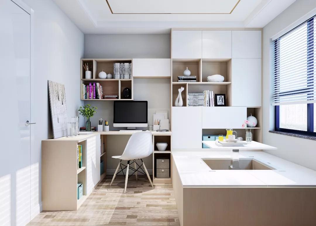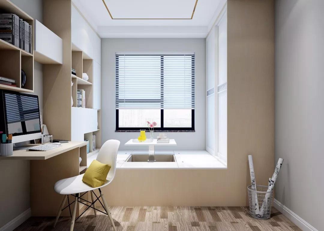 即便是小户型,也要有一个最舒适的精神角落。书桌与装饰储物柜完美结合,榻榻米放在窗户下,兼职休闲区与客房的作用,地台处还能用于收纳各种杂物,榻榻米书房的设计让小空间有了更多可能性。