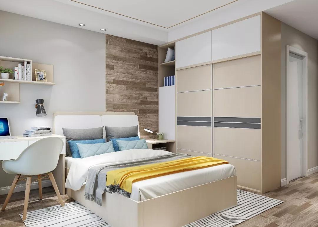 卧室以格调白和原木色为主基调,搭配深浅过渡木纹砖的地面设计,自带色差效果,营造出自然质朴的氛围。嵌入式的移门衣柜,将收纳能力最大化。背景墙是卧室空间最独特的设计,深浅木纹砖与格调白背板混搭,新颖又具有独特魅力,带来卧室不一般的视觉体验。