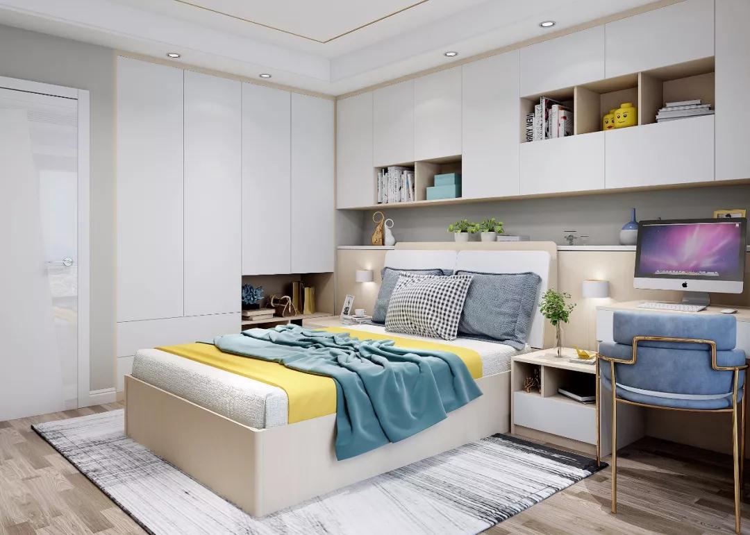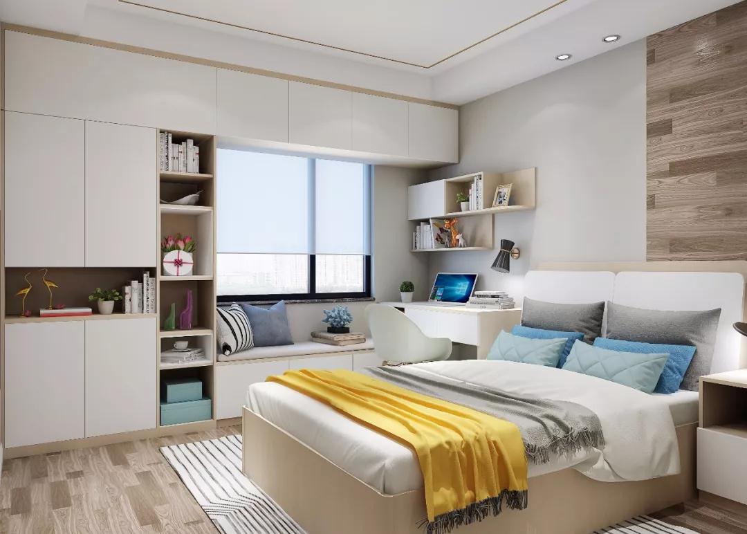 卧室里有一扇超大的窗户,屋主利用格局打造出飘窗组合柜,一柜多用,充分放大空间的储物能力。床上四件套配色也让屋主花足了心思,亮黄色的床单配上薄荷绿和海蓝色的靠枕,浅色系的清新带来温馨明快的视觉感受,卧室是家里待的时间最久的空间,看着舒适,住着更要舒适!