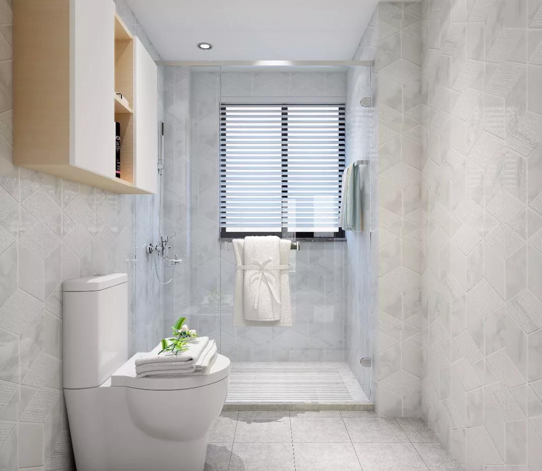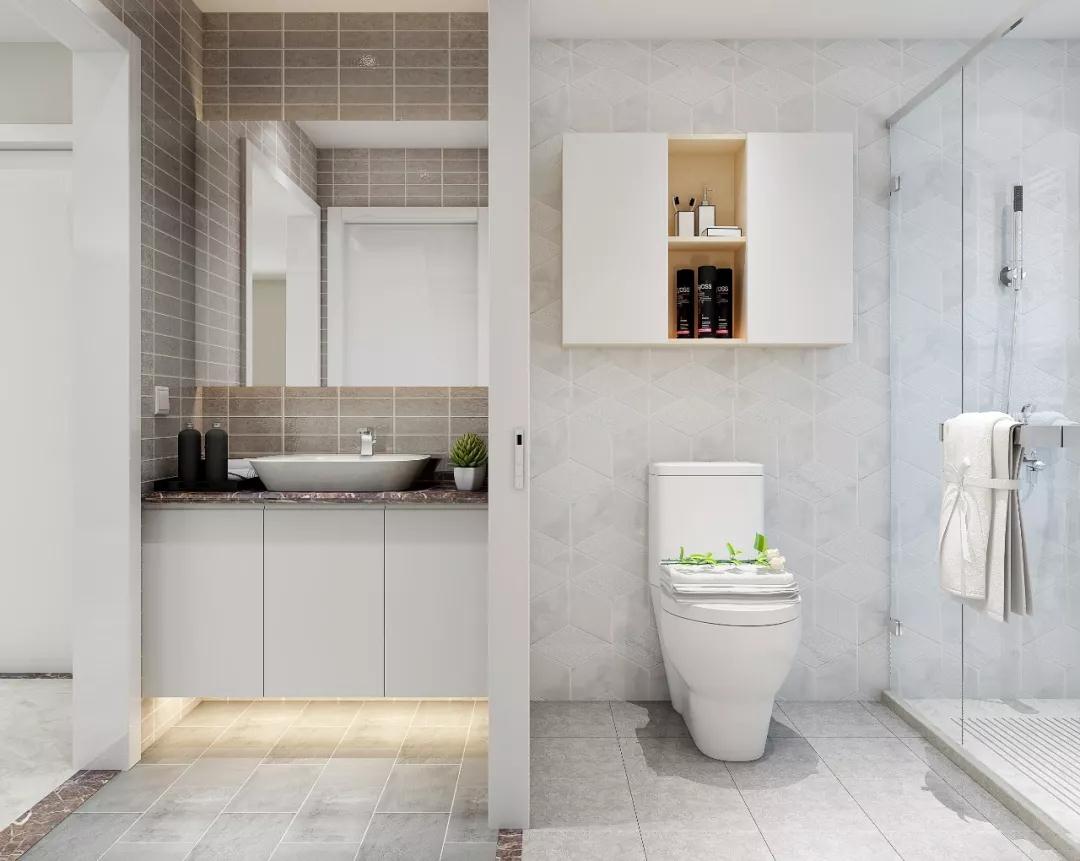 卫生间采用干湿分离的设计方式,淋浴区和马桶区用玻璃进行隔断,加上隔断处的门槛设计,有效进行防水处理。马桶区上方还设计了一组吊柜,用以储存纸巾、浴巾等常用物品,最大限度的利用卫浴这一小空间。