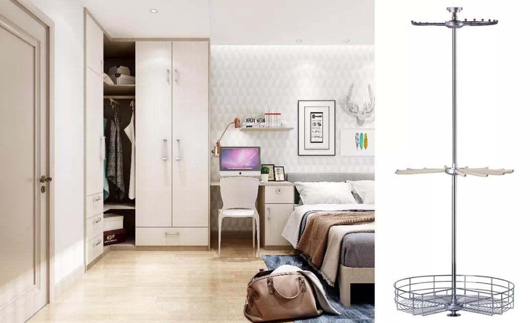 衣柜转角位置柜身比较深,如果担心找衣服太麻烦,不妨装个旋转衣架,360度转动简便收纳,再也不怕找衣服把衣柜弄得乱七八糟了。