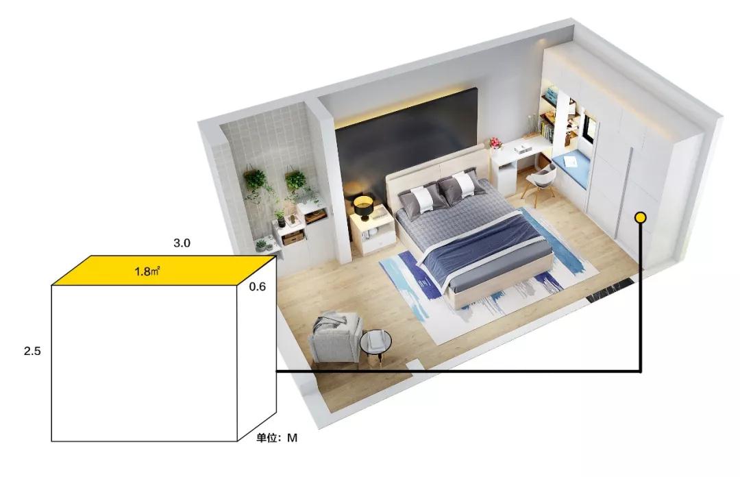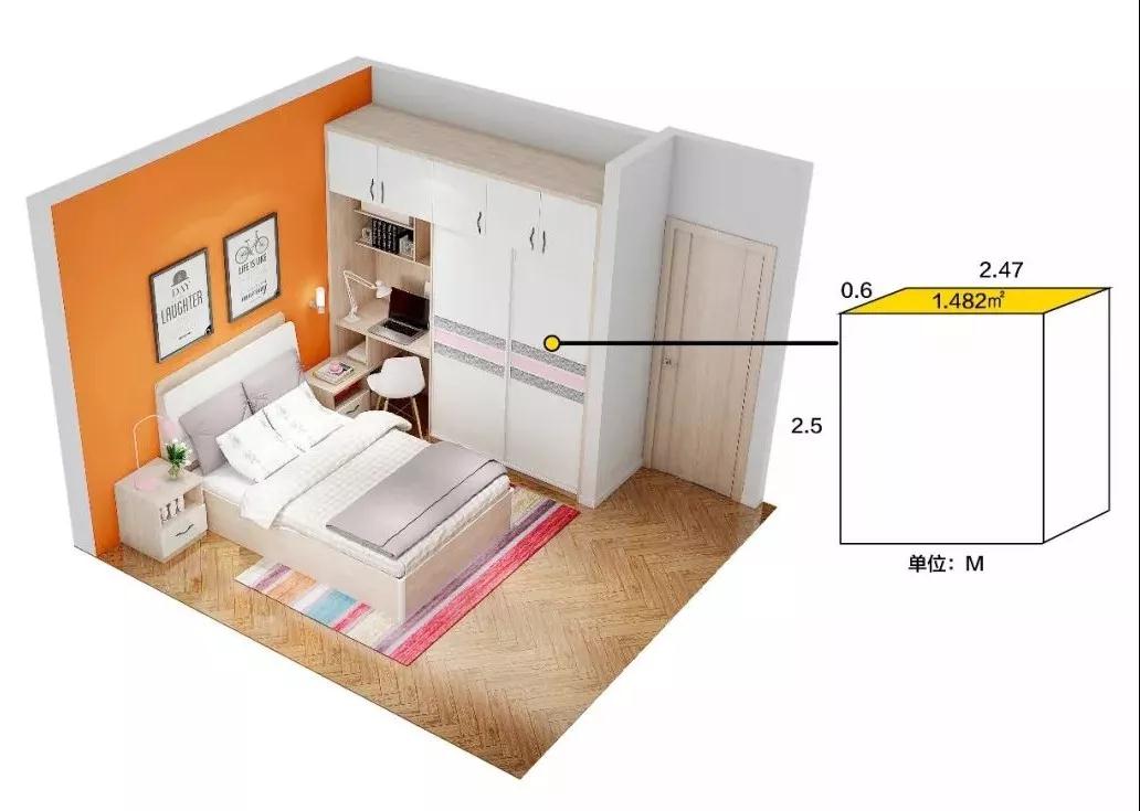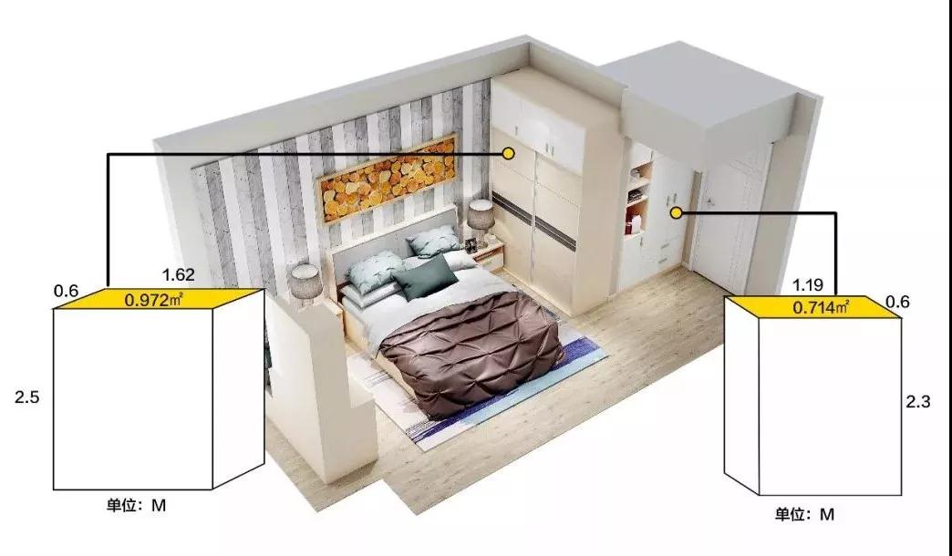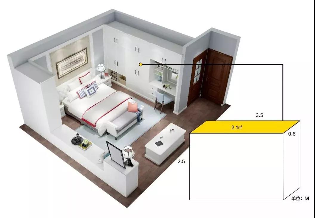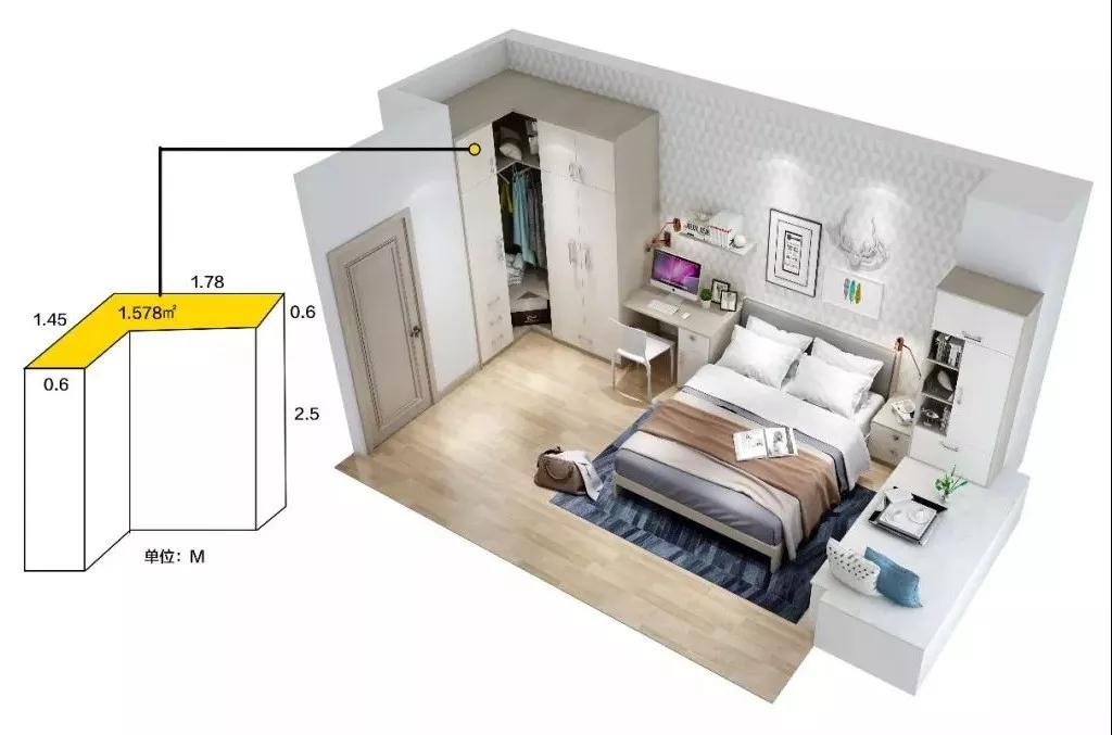 转角蹭得好,还能在卧室蹭出一个储物柜,多出这0.714㎡收纳空间,买再多包包也能轻松放下。