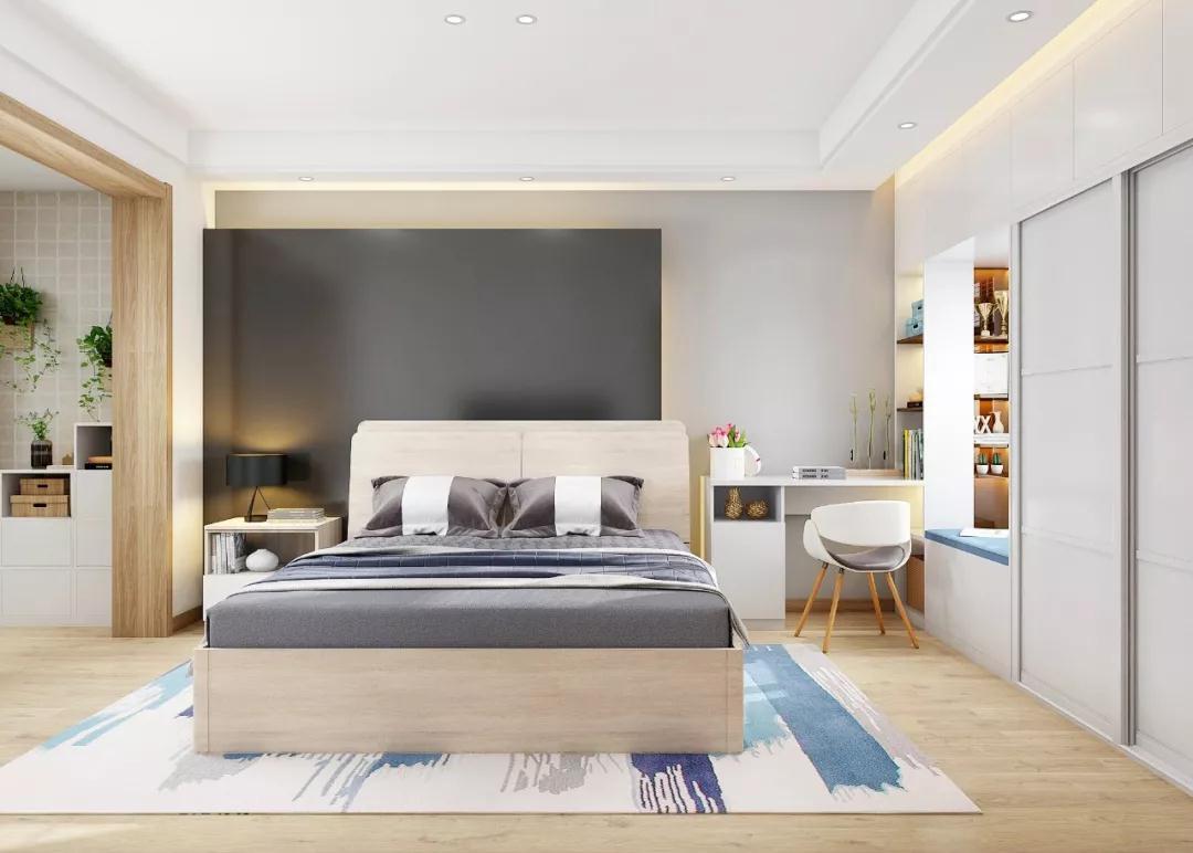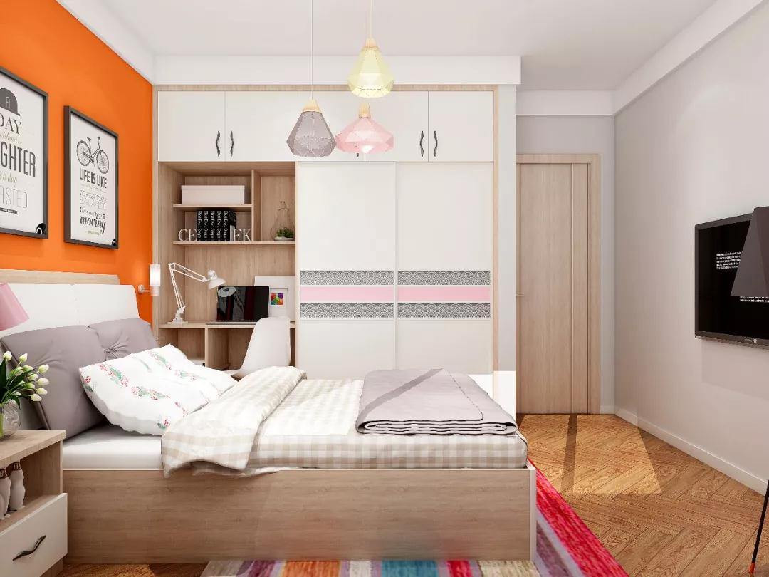 如果说转角衣柜算是少见的情况,那一字型衣柜大家就比较熟了。卧室面积不大,所以大部分卧室的衣柜都是摆在进门靠墙处,以节省卧室空间。如果装修时除了衣柜,还想要梳妆台、书桌等多个功能区,那各种家具的布局就得好好考虑了。