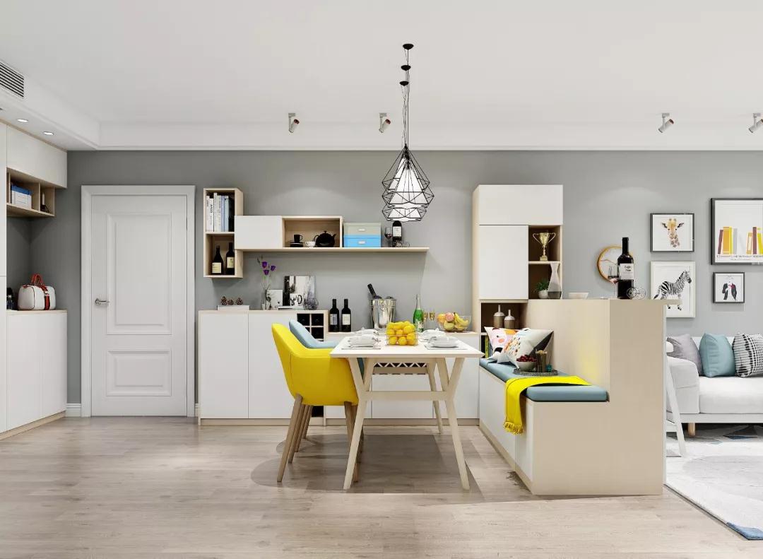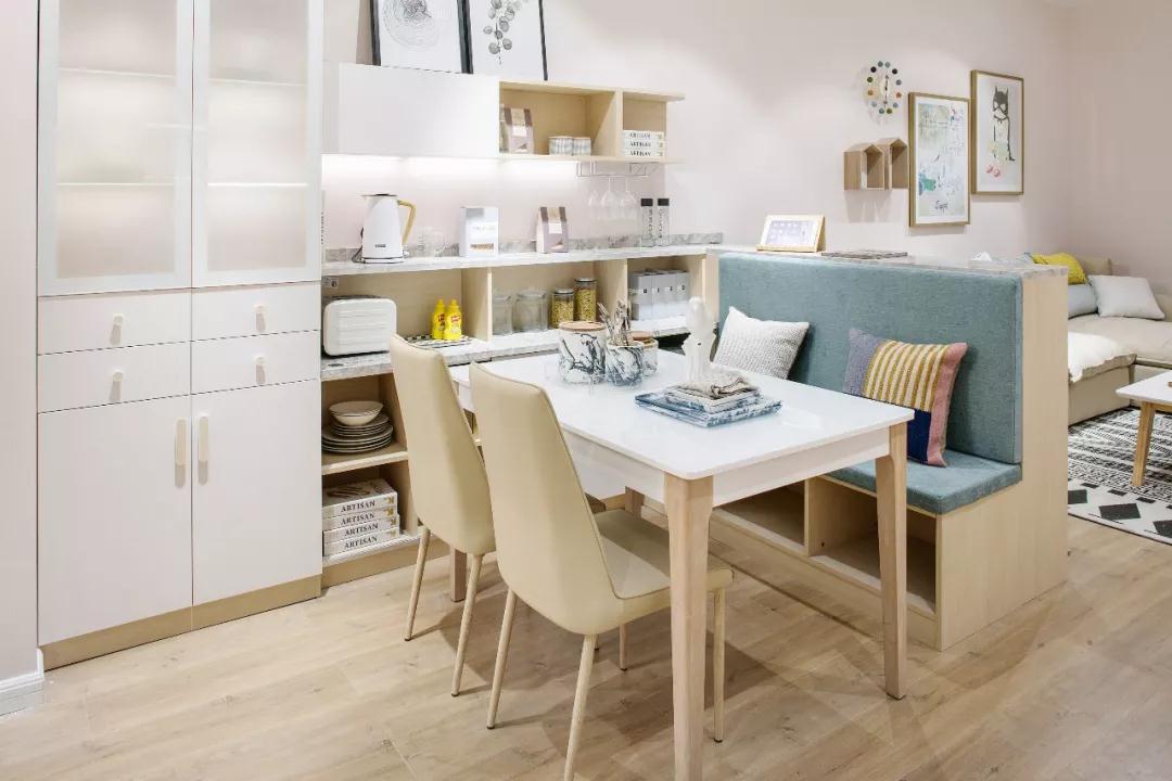 再进阶一点,还可以选择卡座设计,不仅占地空间减少,还可以变身小小的多功能区,收纳和用餐区二合一,颜值和功能两不误。