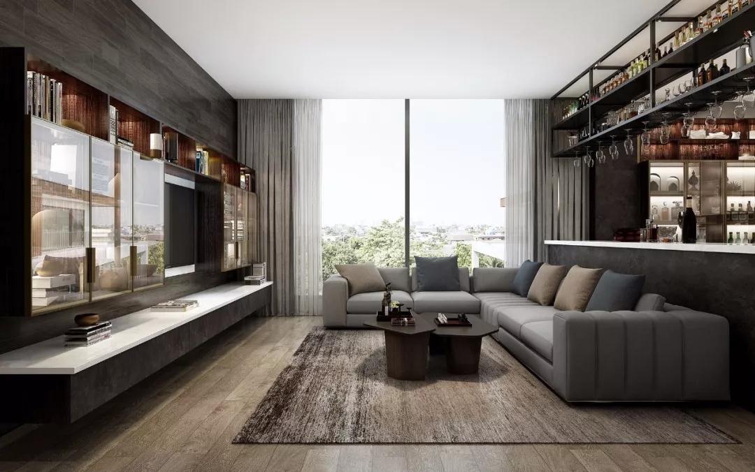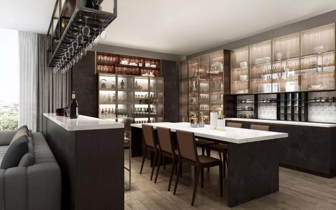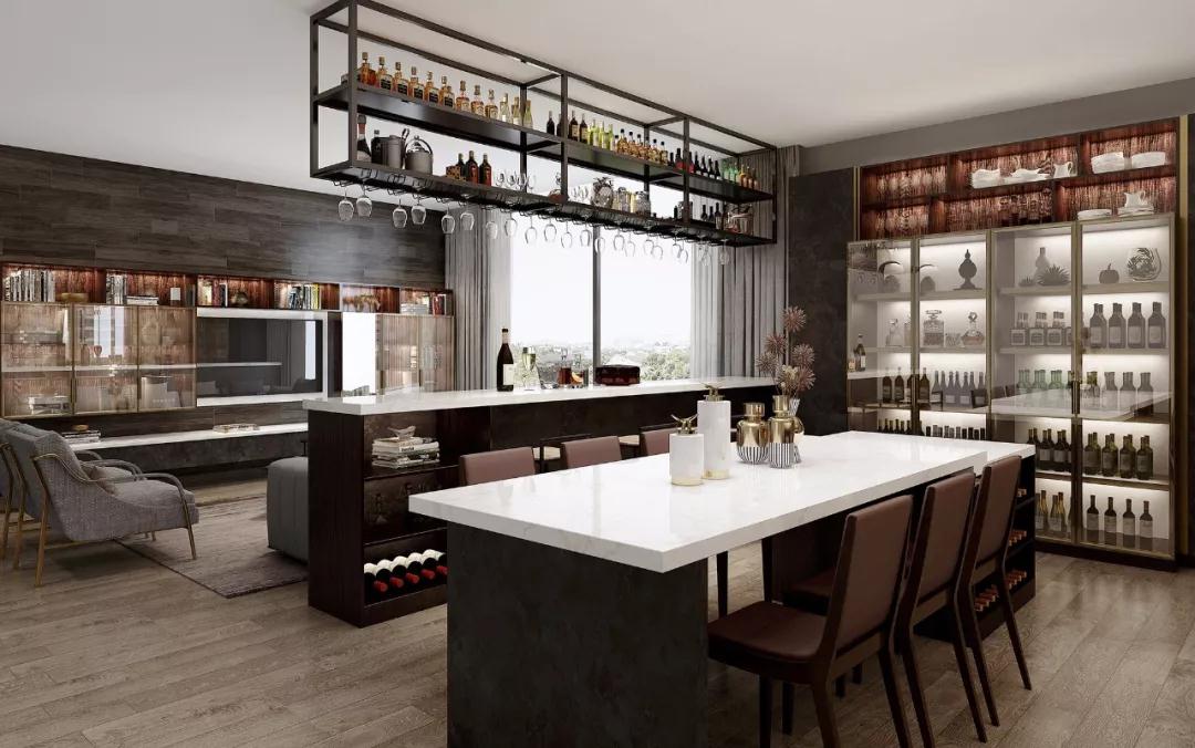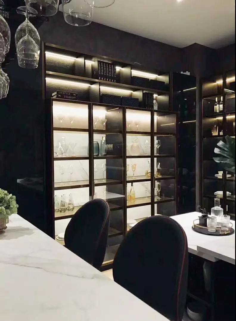 餐厅是收纳柜的天下,毕竟房子再大收纳也不能乱。横贯在餐厅和客厅之间的是长型的吧台,底部自然就是爱酒之人收藏酒器的地方。