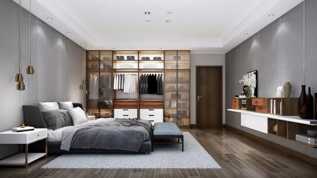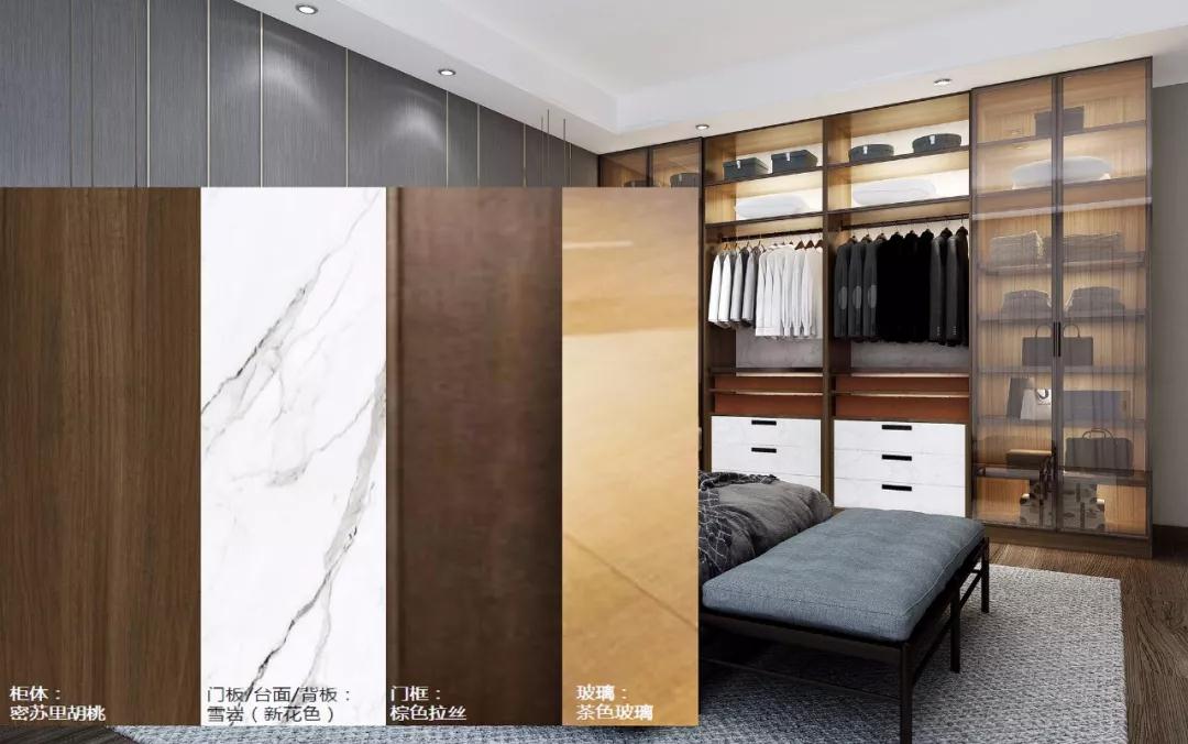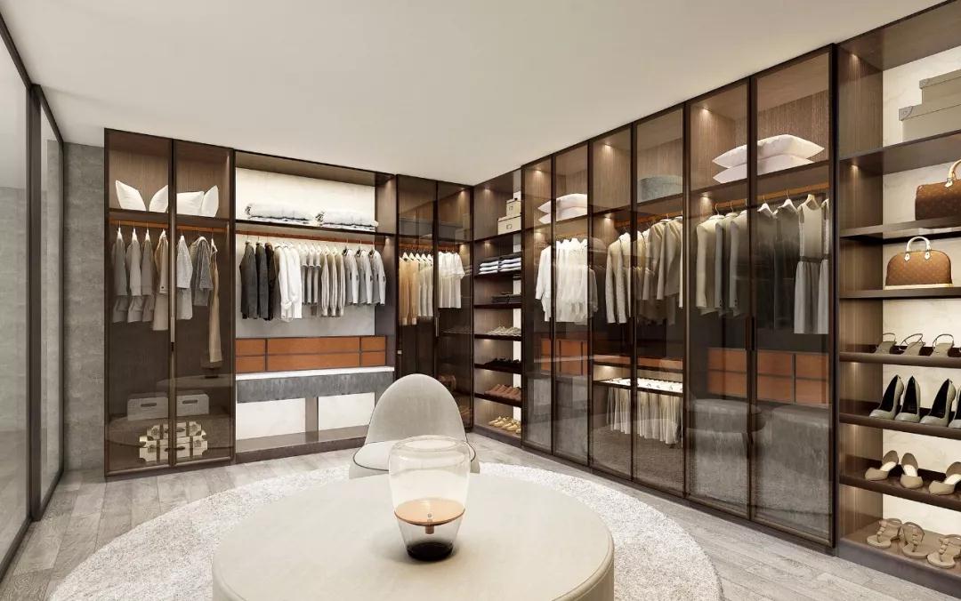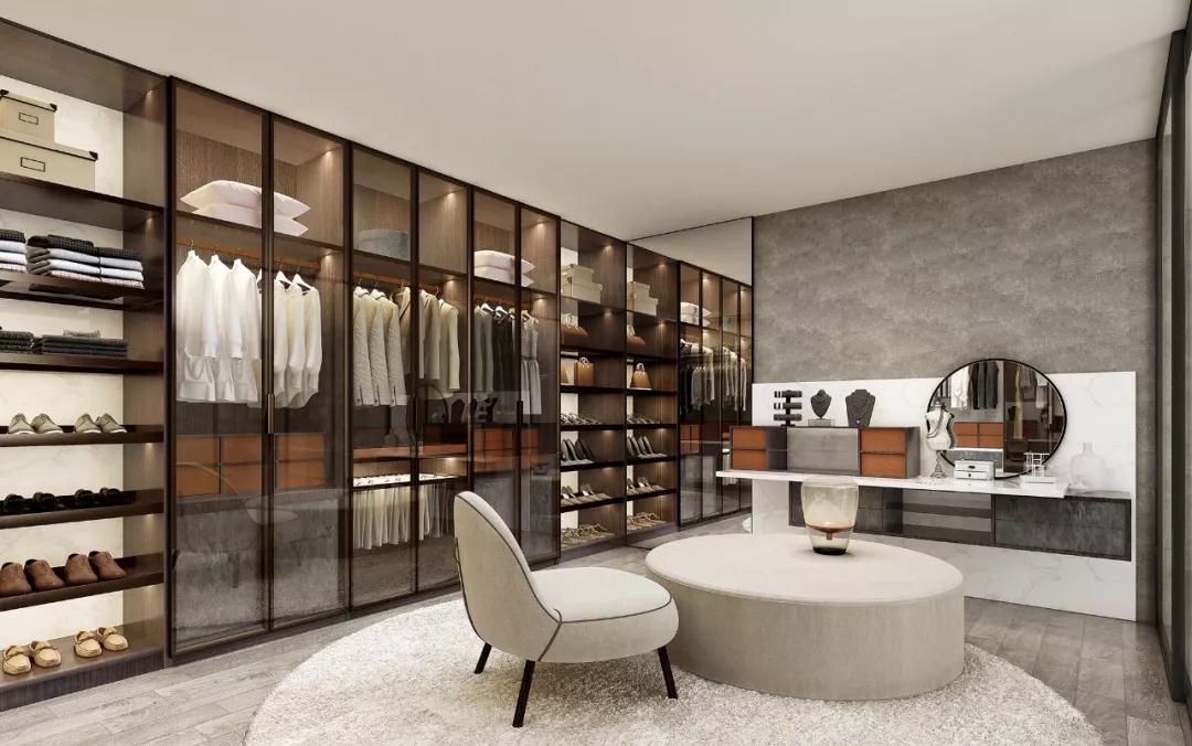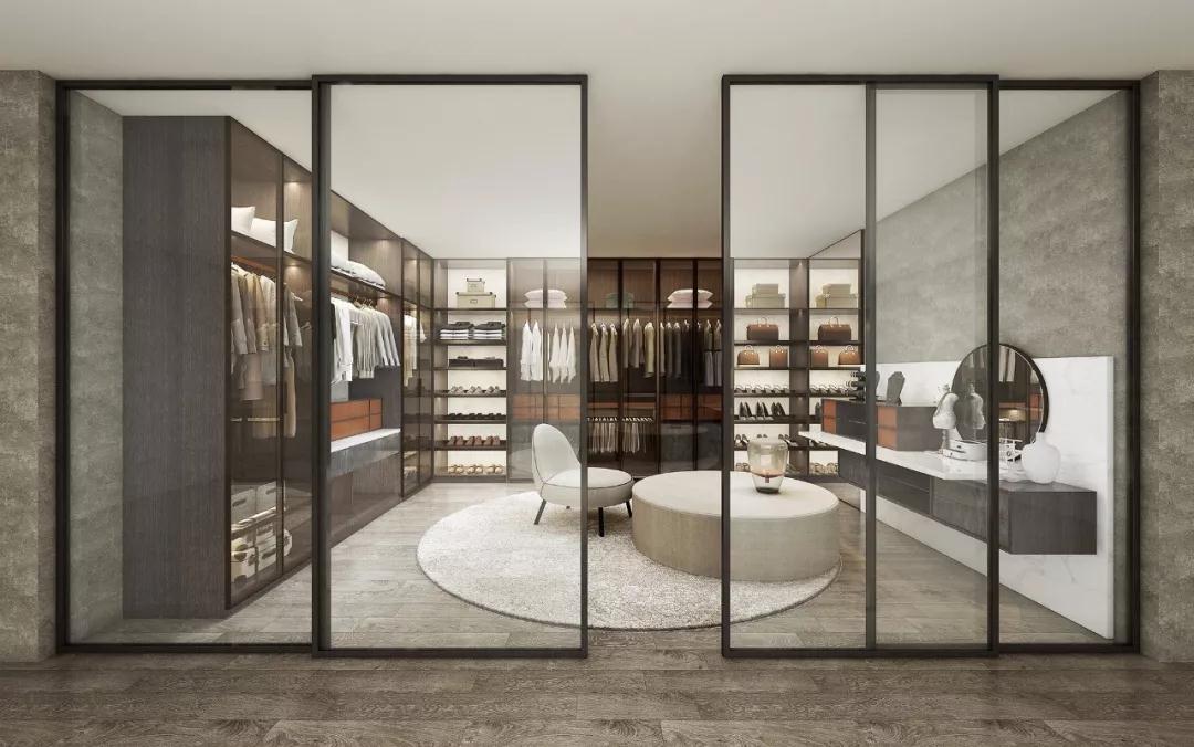 衣帽间设计以轻奢、时尚、现代为目标,隔断门采用全铝框材质,结构稳定,不易变形,一推一拉间安全放心,玻璃质感拉伸空间的开阔感,家具设计游刃有余。