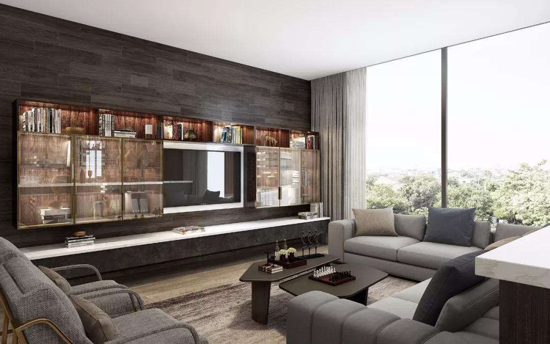 深沉的黑檀花色电视背景墙,遇上简洁流畅的金属线条框架,设计师巧妙地把握住了在轻盈的质感和轻奢之间的平衡。