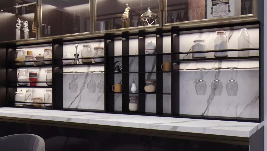 两侧是开放式的展示设计,钢化玻璃的掩门完美解决了落灰的烦恼,玻璃通透的材质,简单却不失品味感。