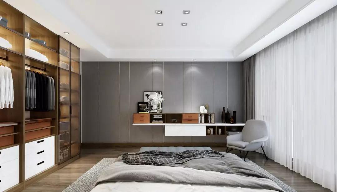 温和的胡桃木是卧室的主色调,简洁的金属线条爬上灰色的墙面,温馨的居家气氛里隐隐地透出一种自然的高级感,简单又安静,躺上去是极度的畅快和舒适。