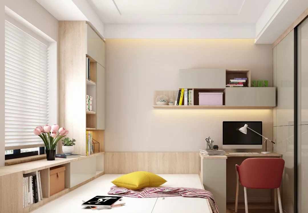 我们选择了用榻榻米,将空间开发到极限,凹陷处做衣柜,临窗位置是榻榻米休息区,吊柜+书桌的设计也极大地节省了空间。