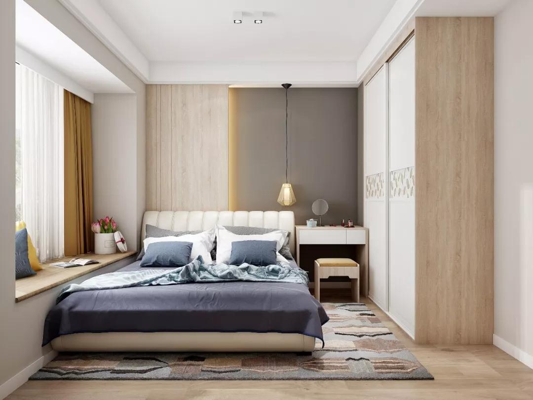 主卧以深灰和浅灰色为主色调,床、衣柜、地板等都采用了统一的原木色调,靠床的背景墙加了一面原木色的护墙板,装上LED灯带,营造出卧室的柔和浪漫氛围。