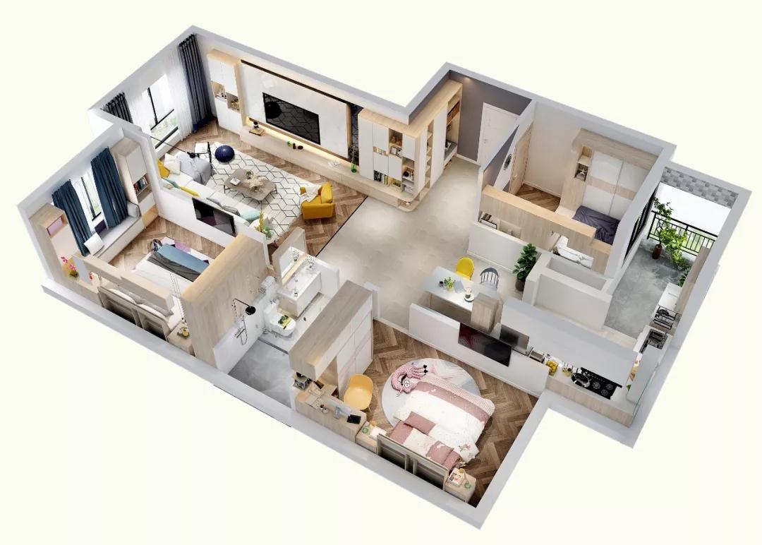 具体方案:用紫色搭配出亮眼有趣的客餐厅和卧室,厨房、榻榻米搭配灰色高级又明亮