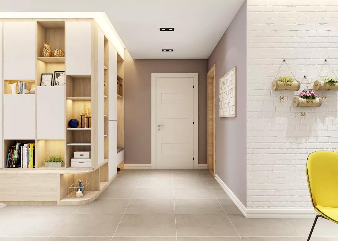 入户玄关面积不小,但是本着不能浪费空间的原则,我们在右手边设计了到顶的多功能玄关柜。